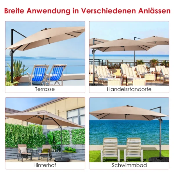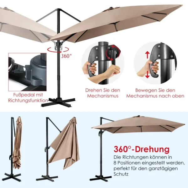 - Skėčio pasvirimas reguliuojamas švaistikliu, o 360° pasukimas leidžia patogiai keisti šešėlio padėtį.
