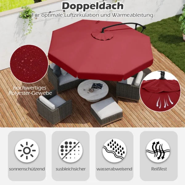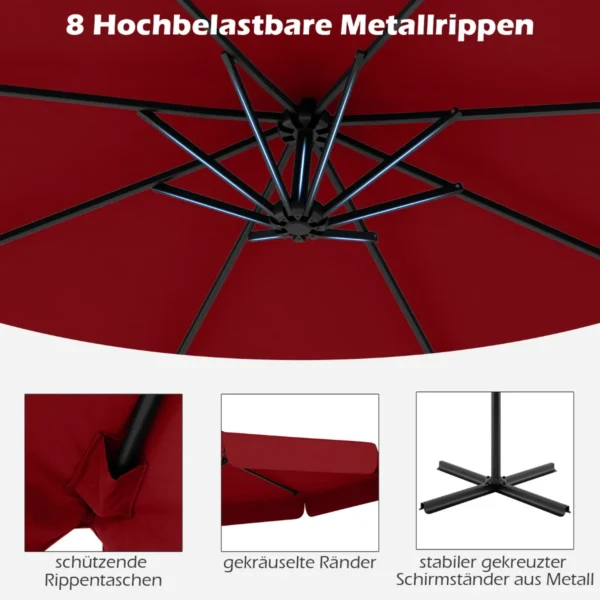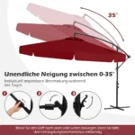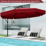 Lauko skėtis 305x250cm raudonos ir juodos spalvos yra puikus pasirinkimas terasoms, sodams ar baseinų zonoms, suteikiantis patikimą pavėsį. Šis pakabinamas skėtis tinka tiek privačioms, tiek komercinėms lauko erdvėms, užtikrinant patogų naudojimą ir ilgaamžiškumą.