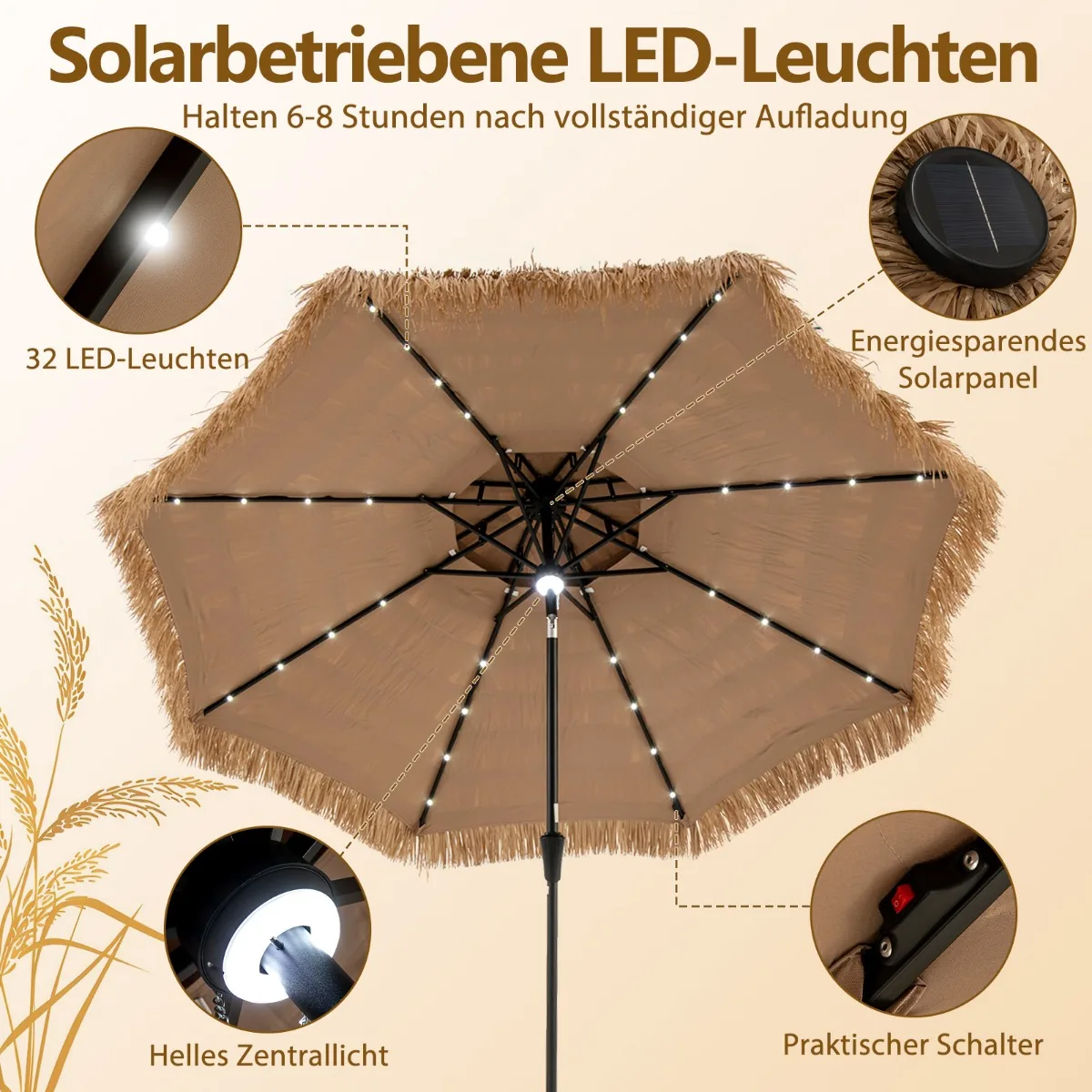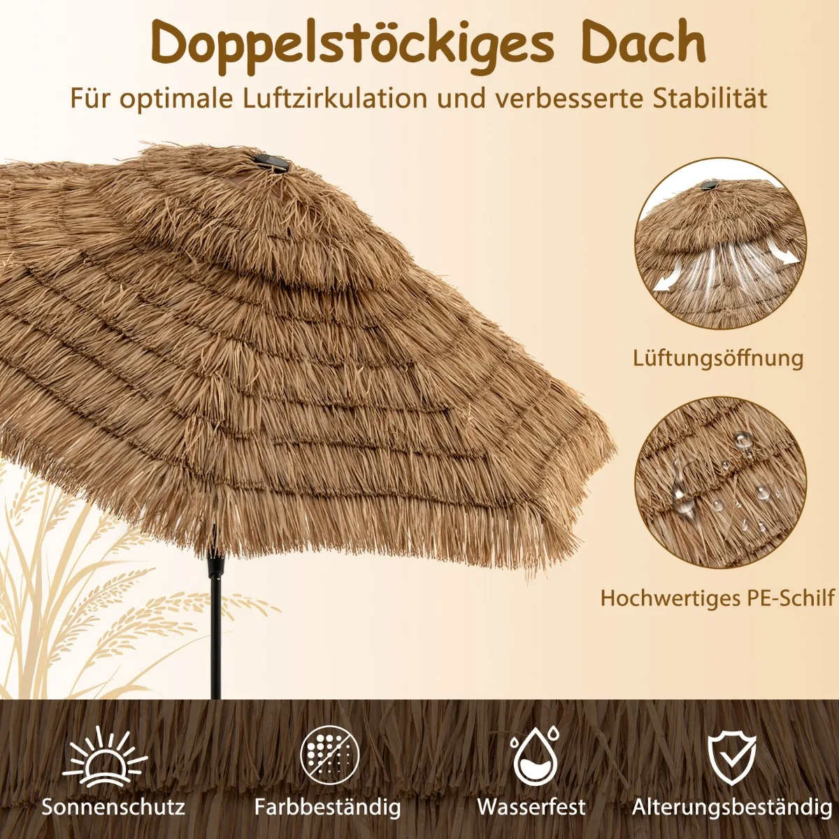 Lauko skėtis 313×251 cm, rudos ir juodos spalvos, skirtas apsaugoti nuo saulės ir sukurti atpalaiduojančią lauko zoną. Idealiai tinka sodui, terasai ar paplūdimiui, suteikia vėsią šešėlio erdvę ir lauko atmosferei tropinį pojūtį. Dviejų sluoksnių PE šiaudų stogas ir reguliuojamas pakreipimas užtikrina patogų naudojimą įvairiomis oro sąlygomis.