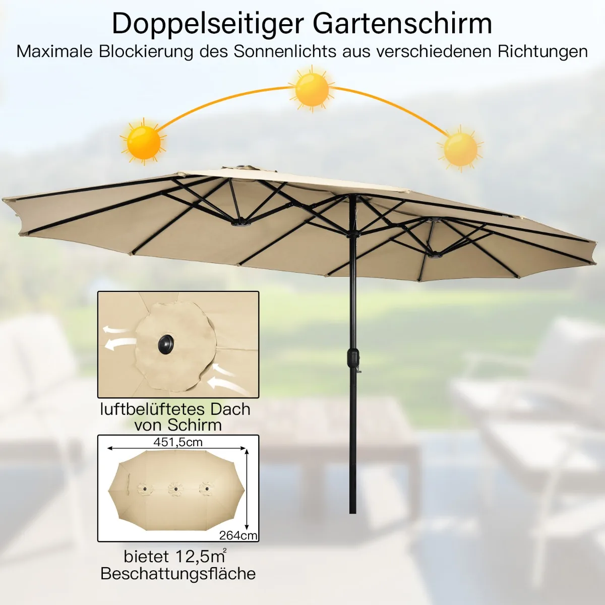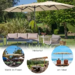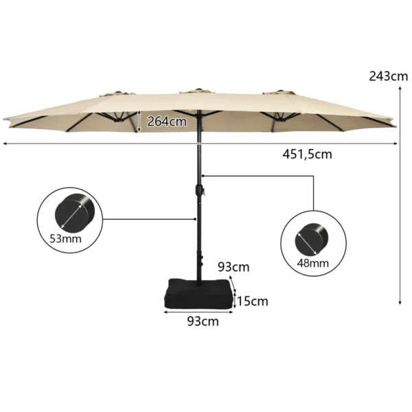 - Dvipusis kiemo skėtis su 451,5 cm baldakimu suteikia daug šešėlinės erdvės.