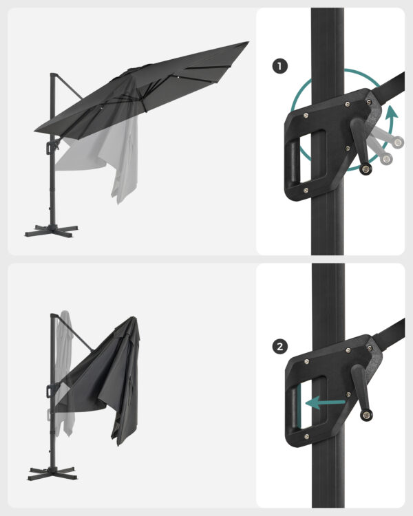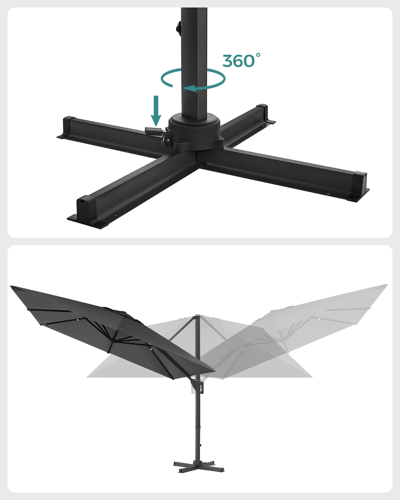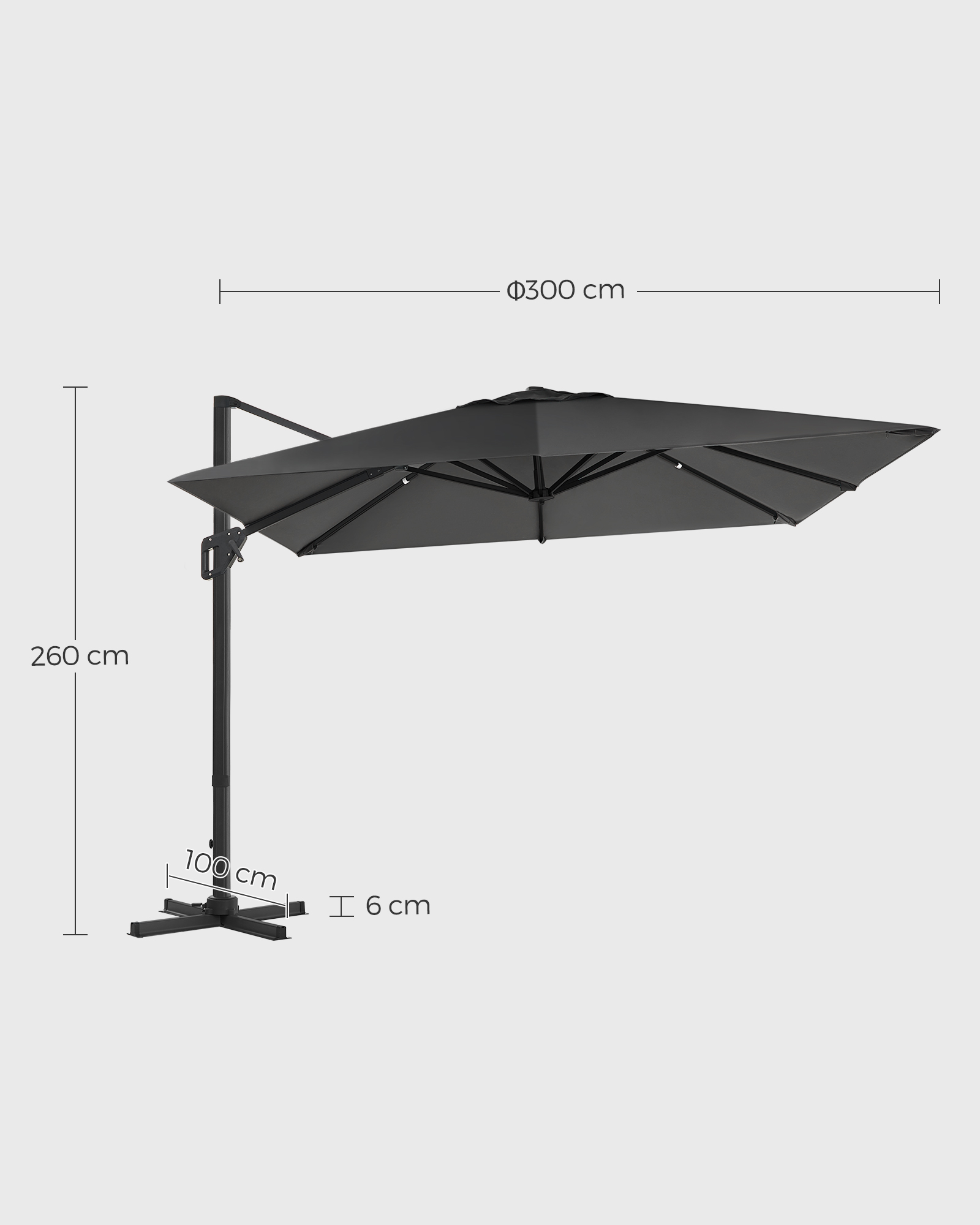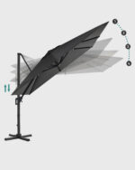 Šis elegantiškas ir funkcionalus lauko skėtis nuo saulės yra puikus pasirinkimas tiems, kurie nori mėgautis lauko erdve, apsaugoti nuo saulės spindulių ir suteikti savo kiemui ar terasai modernų akcentą. Juodos spalvos dizainas suteikia skėčiui išskirtinį ir stilingą išvaizdą, puikiai derančią prie įvairių lauko baldų.
