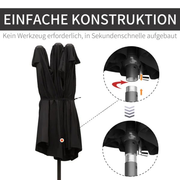 Du kartus geriau! Visiems, ieškantiems šiek tiek daugiau šešėlio šiltomis dienomis, mūsų aukštos kokybės dvigubas skėtis iš Outsunny puikiai tiks. Jūsų sodo skėtis visada gerai atrodo sode, terasoje, paplūdimyje ar kartu keliaujant kempinge. Atidarymas ir uždarymas yra vaikiškas žaidimas naudojant pritvirtintą rankinį švaistiklį. Dvylika aukštos kokybės metalinių statramsčių užtikrina aukštą stabilumą. Vasara gali ateiti!