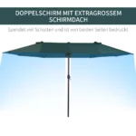 Du kartus geriau! Visiems, ieškantiems šiek tiek daugiau šešėlio šiltomis dienomis, šis aukštos kokybės dvigubas skėtis iš Outsunny puikiai tiks. Sode, terasoje, paplūdimyje ar kartu keliaujant kempinge šis skėtis išpjauna figūrą ir suteikia jums apsauginį stogą virš galvos. Atidarymas ir uždarymas yra vaikiškas žaidimas naudojant pritvirtintą rankinį švaistiklį. Dvylika aukštos kokybės metalinių statramsčių užtikrina aukštą stabilumą. Vasara gali ateiti!