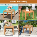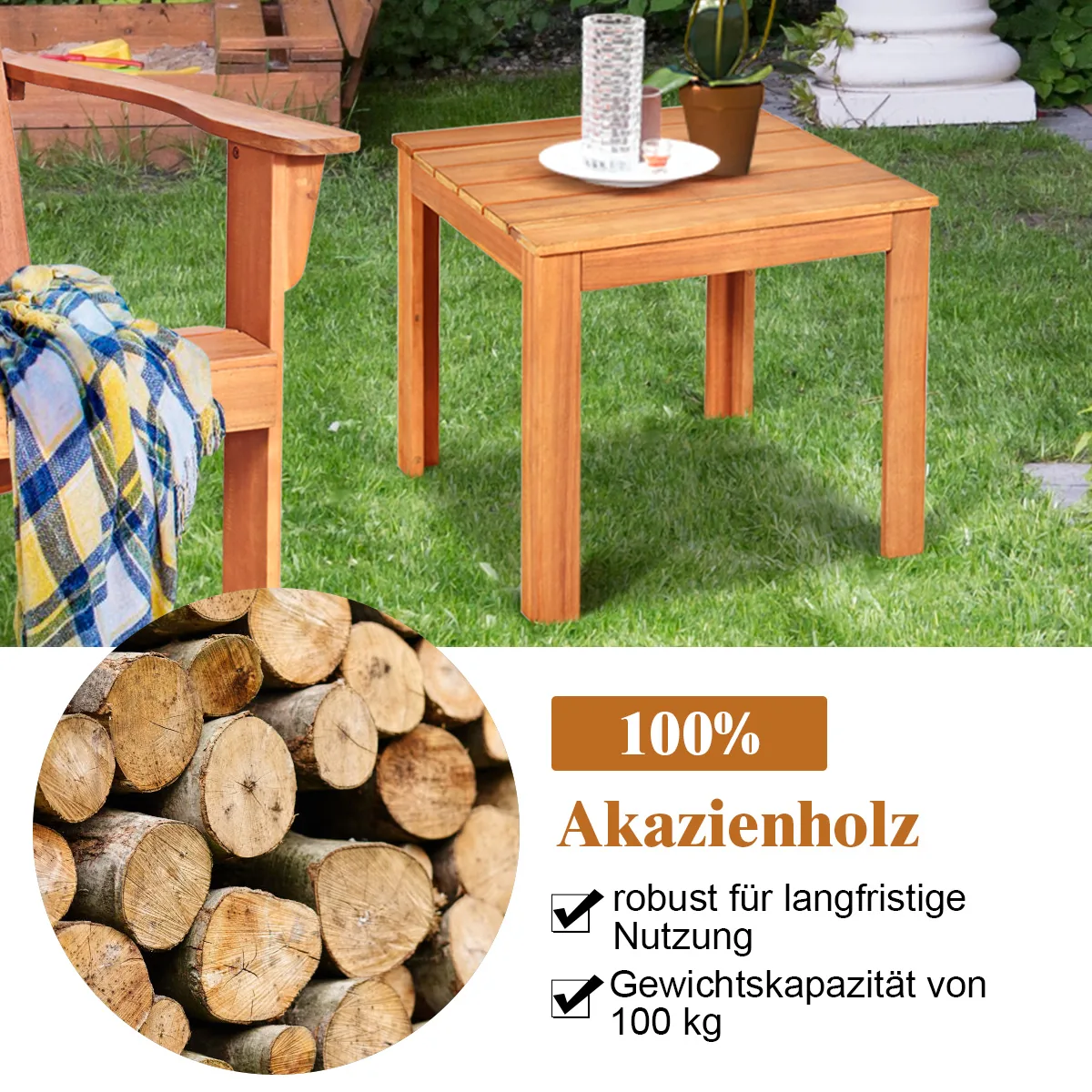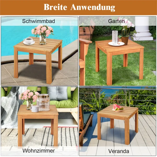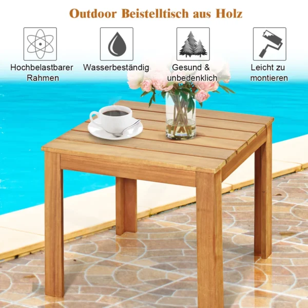 Lauko stalas 45x45x40,5 cm šviesiai rudos spalvos – praktiškas medinis šoninis staliukas, tinkantis naudoti tiek lauko, tiek vidaus erdvėse. Pagamintas iš natūralios akacijos medienos, jis pasižymi ilgaamžiškumu ir patvarumu. Kompaktiškas dydis leidžia jį lengvai pritaikyti įvairiose vietose, tokiose kaip sodas, terasa ar svetainė.