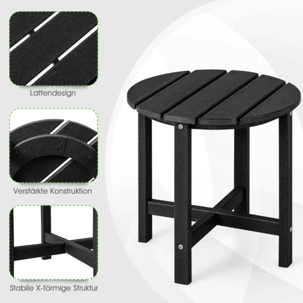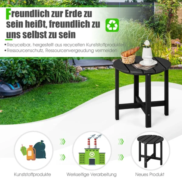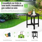 Lauko stalas 46x46cm, juodos spalvos, sukurtas naudoti lauke kartu su Adirondack kėdėmis ir kitais lauko baldais. Šis patvarus šoninis stalas pagamintas iš atsparios oro sąlygoms HDPE medžiagos, todėl puikiai tinka įvairioms lauko sąlygoms.