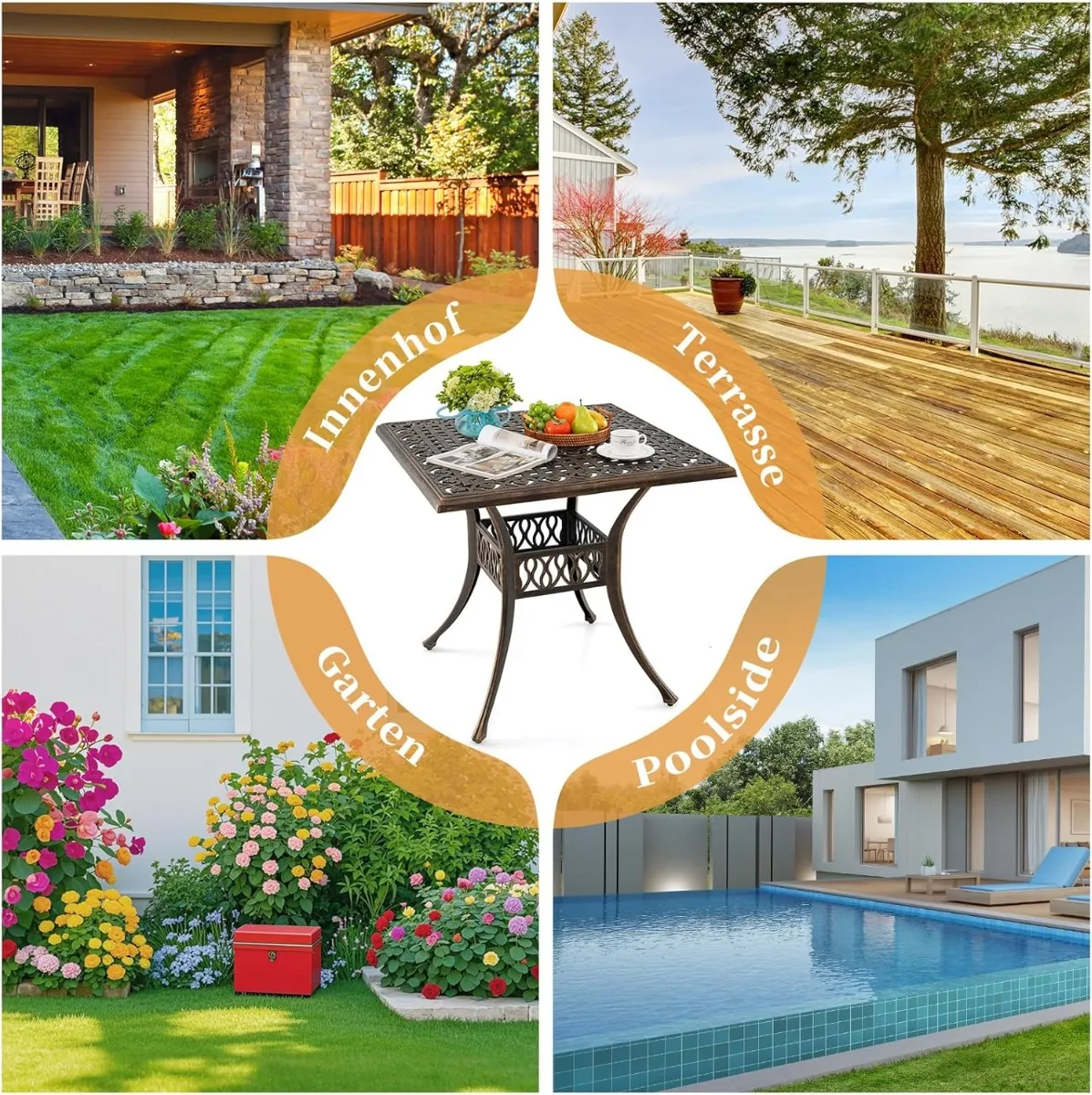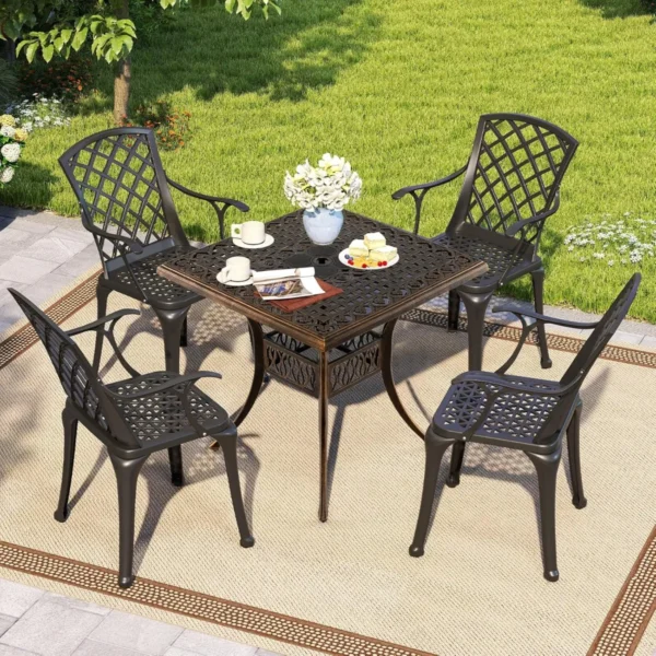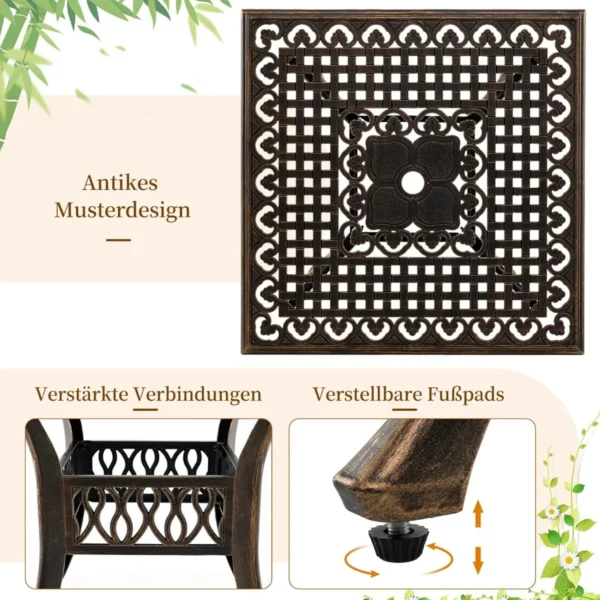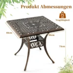 Lauko stalas 80x80x75cm bronzinės spalvos – patvarus ir pritaikytas įvairioms lauko erdvėms. Šis kvadratinis bistro stalas pagamintas iš lietaus aliuminio, kuris užtikrina atsparumą rūdims ir oro sąlygoms. Didesnis stalviršis talpina iki 4 žmonių ir yra tinkamas naudoti terasoje, sode ar prie baseino.