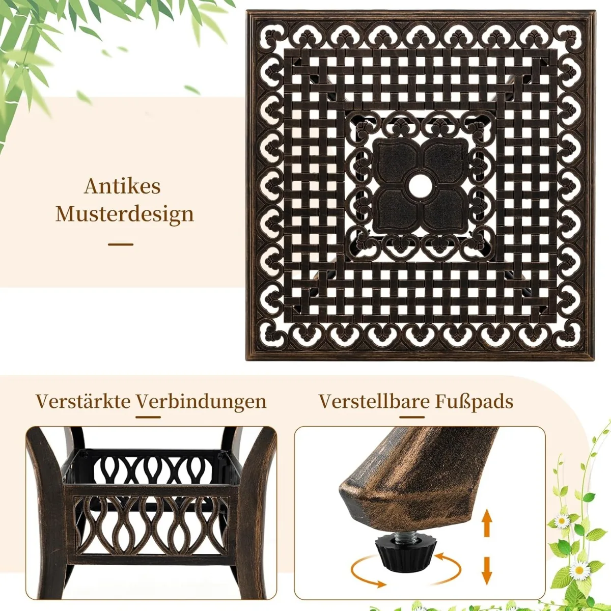 - Bronzinė spalva ir senovinių raštų dekoras pritaikytas lauko aplinkai.