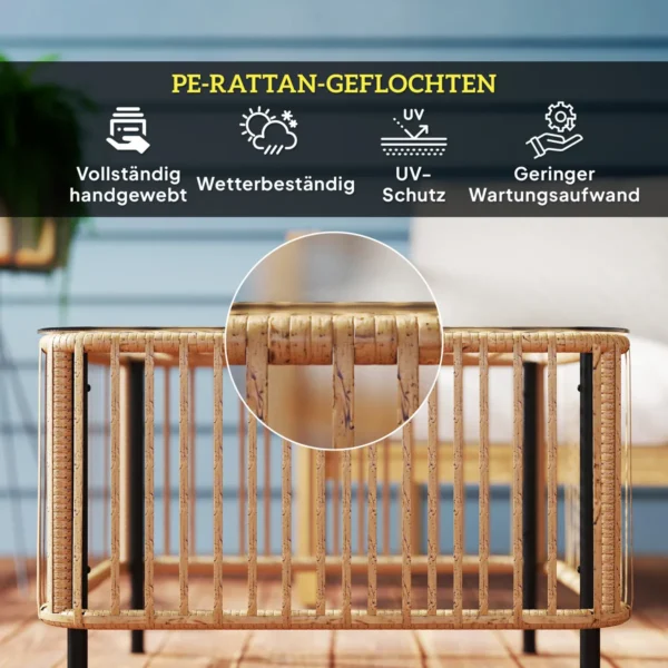 Padarykite savo sodą spindintį su saulės spindulių dizaino sodo stalu Outsunny. Šis sodo stalas yra su plieniniu rėmu ir oro sąlygoms atspariu PE rotangu, taip pat UV atsparia milteline danga ir garantuoja ilgalaikę eleganciją. Šoninio staliuko stalviršis, pagamintas iš grūdinto skaidraus stiklo, sujungia eleganciją ir lengvą priežiūrą – puikus priedas prie visų lauko zonų.