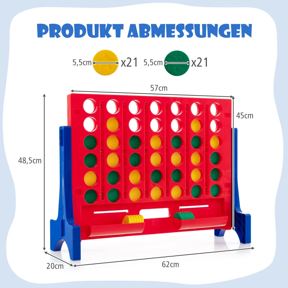 Lauko žaidimas „Keturis iš eilės“ (62x20x48,5 cm) – universalus ir smagus žaidimas tiek vaikams, tiek suaugusiems. Žaidimą galima naudoti ant stalo arba pritvirtinti prie sienos, todėl jis tinka viduje ir lauke, šeimos renginiams bei vakarėliams. Žaidimo tikslas – pirmajam sudėti keturias figūrėles horizontaliai, vertikaliai arba įstrižai.