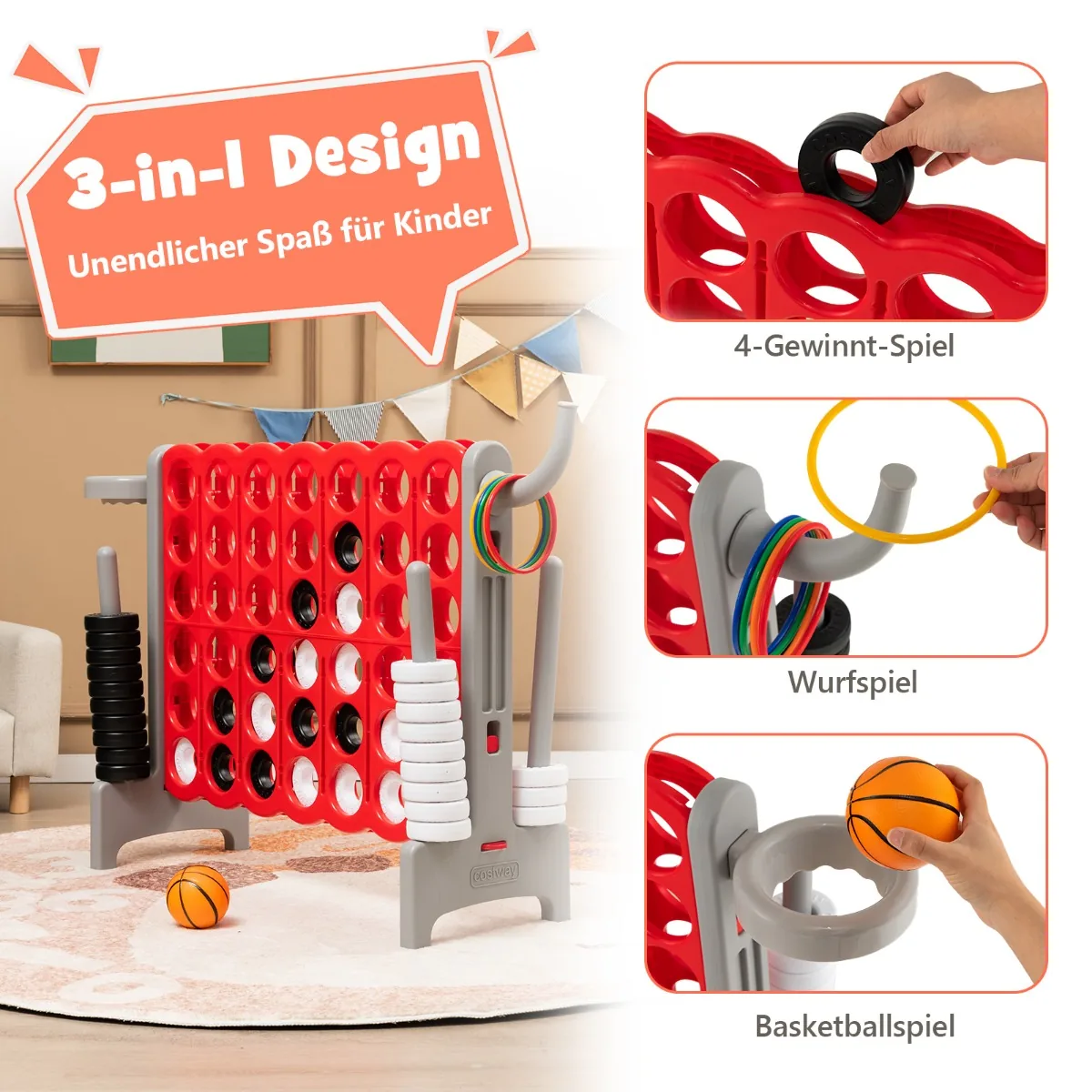 Lauko žaidimas keturis iš eilės 84x33x79 cm, raudonos/pilkos spalvos – didelė klasikinio keturis iš eilės žaidimo versija, tinkama žaisti lauke ir viduje. Šis žaidimas skatina vaikų ir suaugusiųjų motorinius įgūdžius, logiką bei rankų ir akių koordinaciją.
