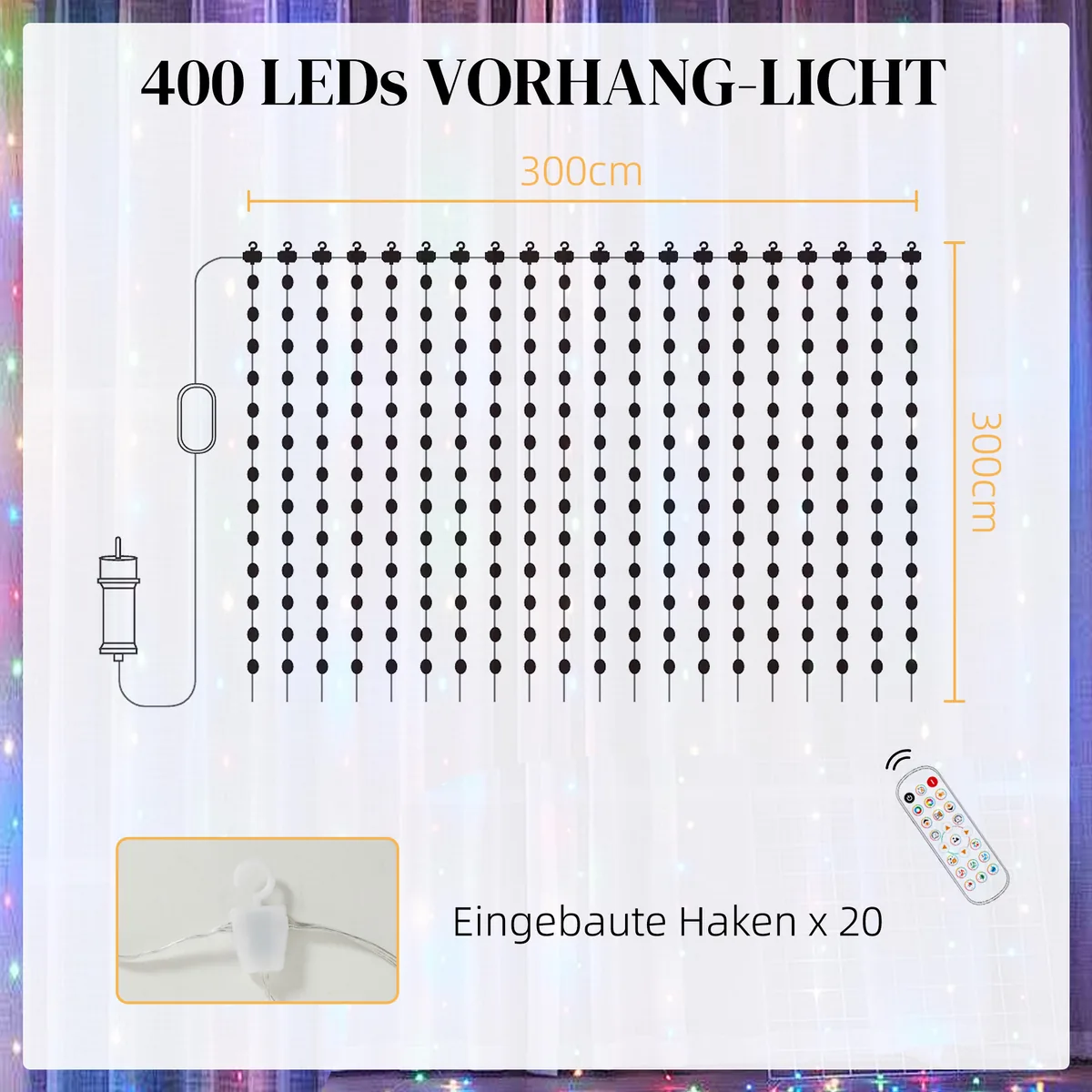 - ✔ Su 3 x 3 m dydžio ir 400 ryškių LED karoliukų didesniam pikselių tankiui