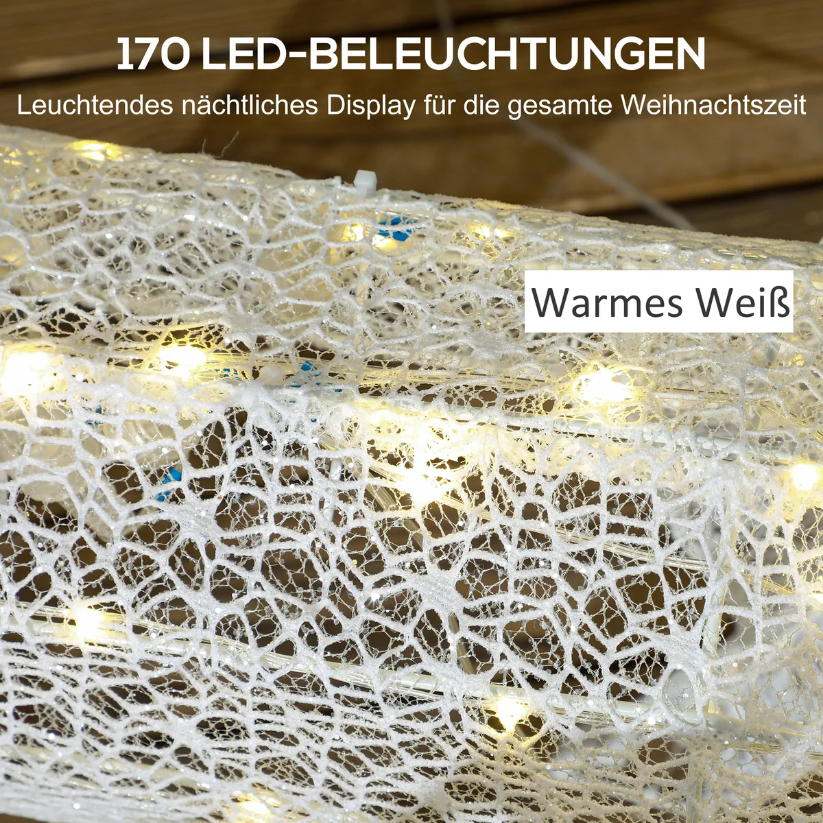 - ✔ 170 šiltų baltų kalėdinės dekoracijos LED lempučių suteikia ryškų efektą ir metalinį plastiko matomumą naktį.