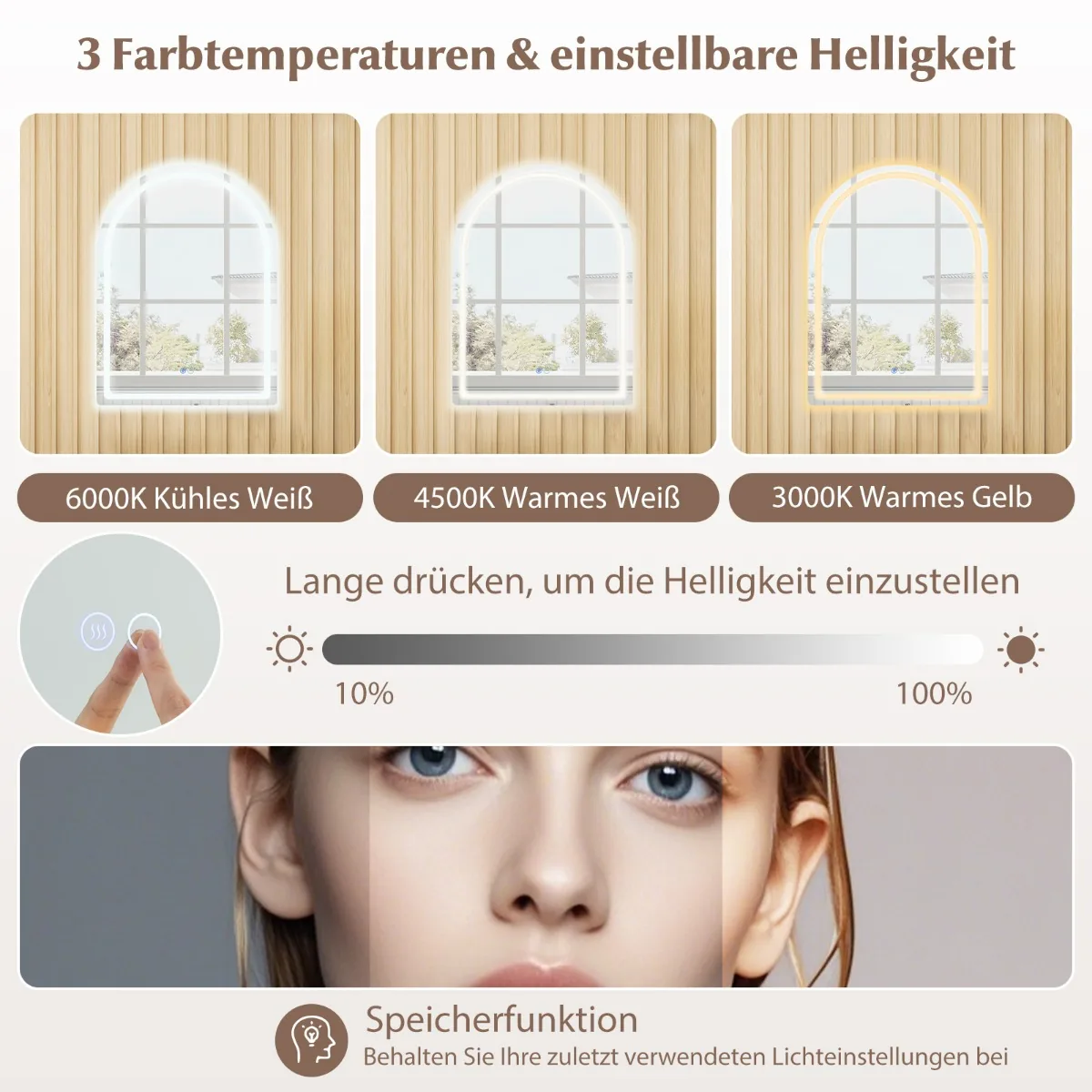 - 3 spalvų temperatūros režimai ir reguliuojamas ryškumas jutikliniu jungikliu.
