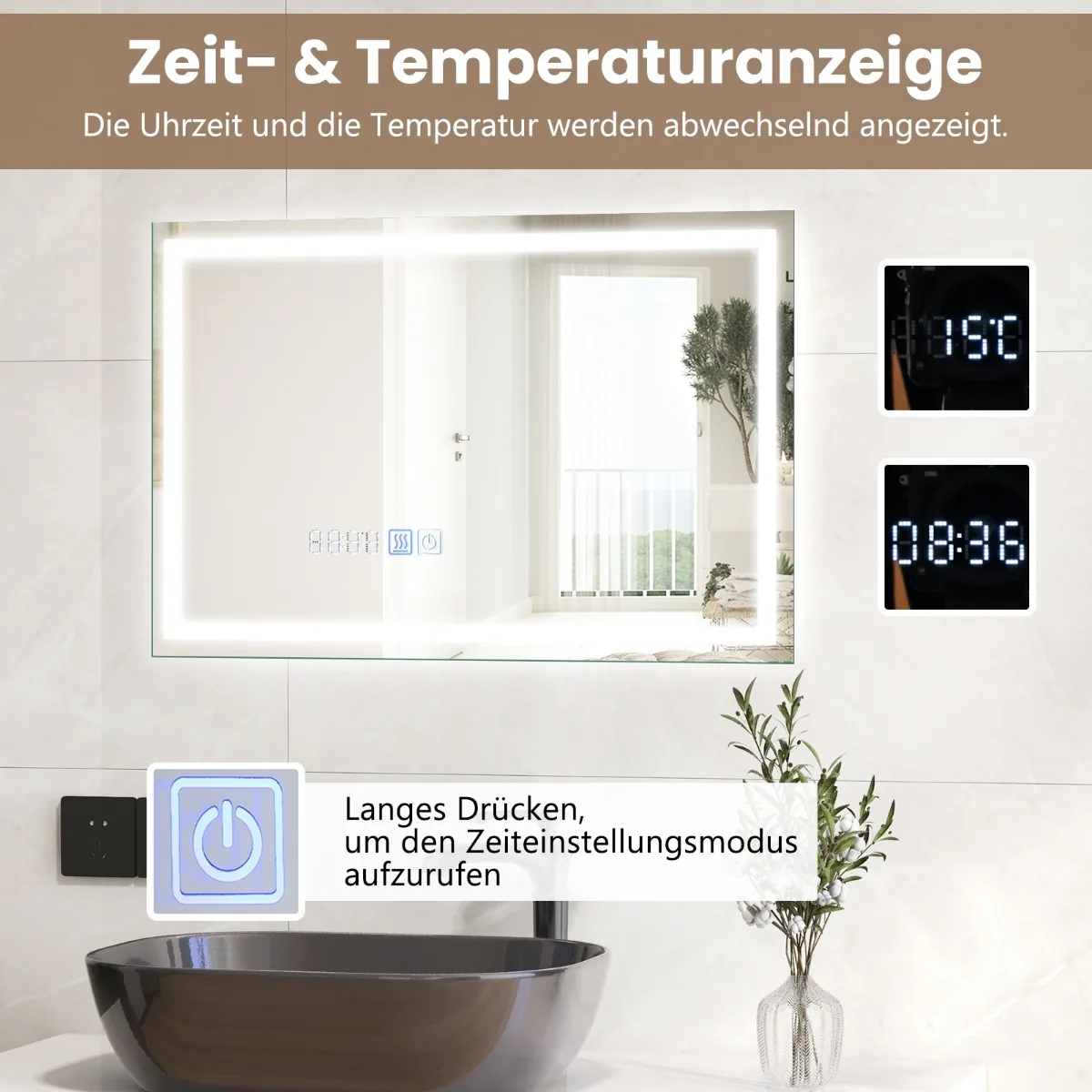 - Laiko ir temperatūros ekranas integruotas į veidrodžio paviršių.