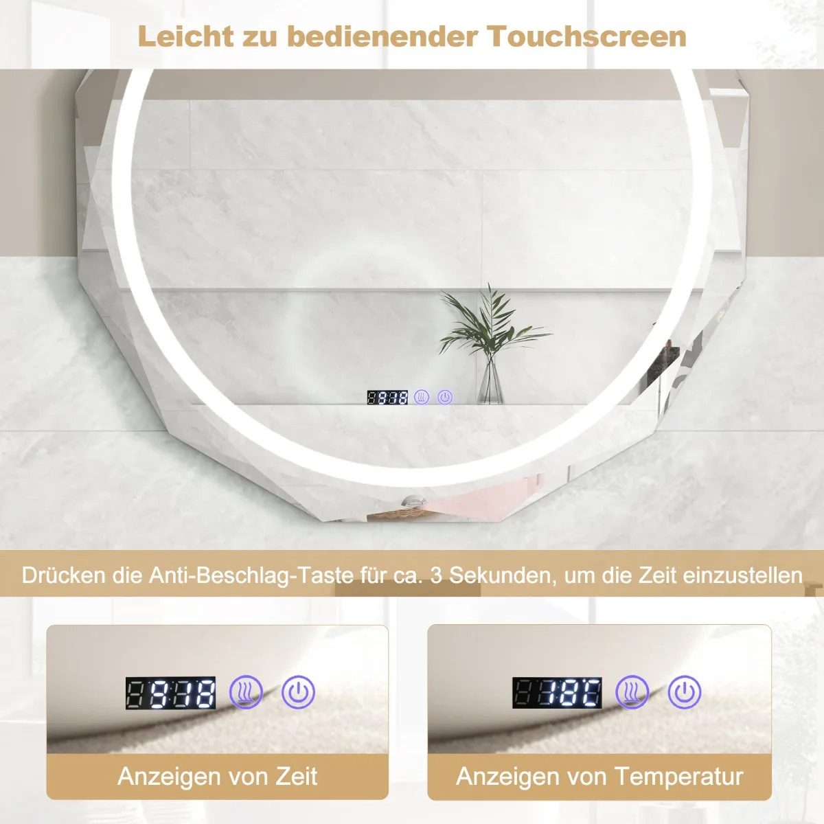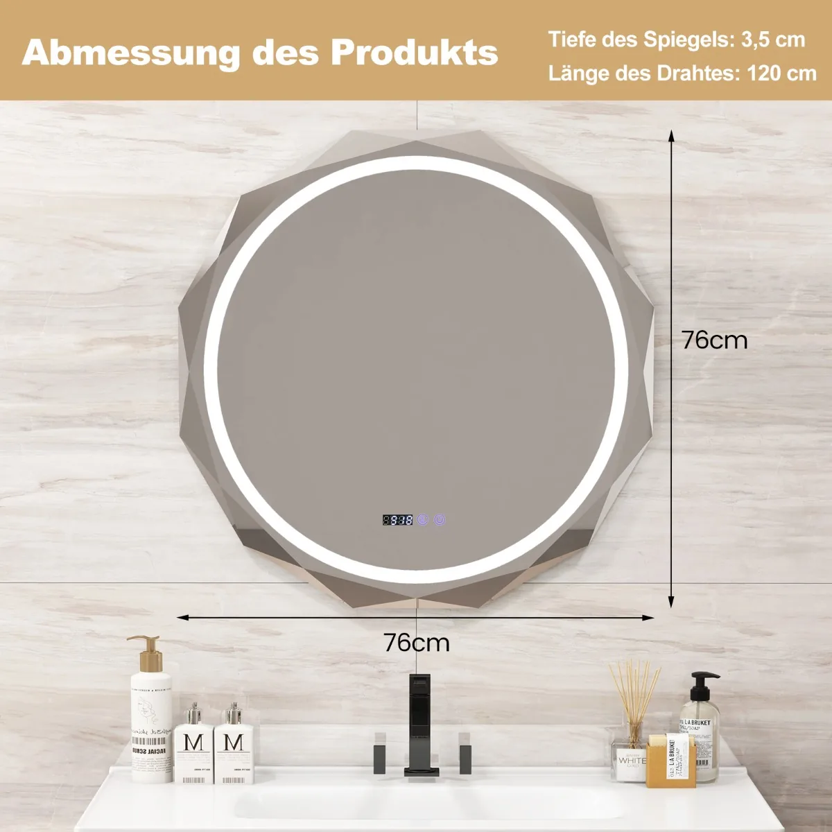 Led sieninis veidrodis 76x76x3,5cm, sidabrinės ir baltos spalvos, puikiai tinka vonios kambariui. Veidrodis turi nerasojančią funkciją ir tris LED šviesos spalvas, leidžiančias reguliuoti apšvietimą pagal poreikį. Integruotas jutiklinis ekranas rodo laiką ir temperatūrą, taip pat užtikrina patogų valdymą.