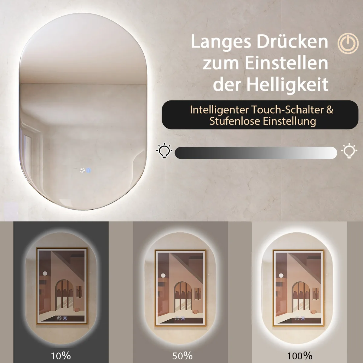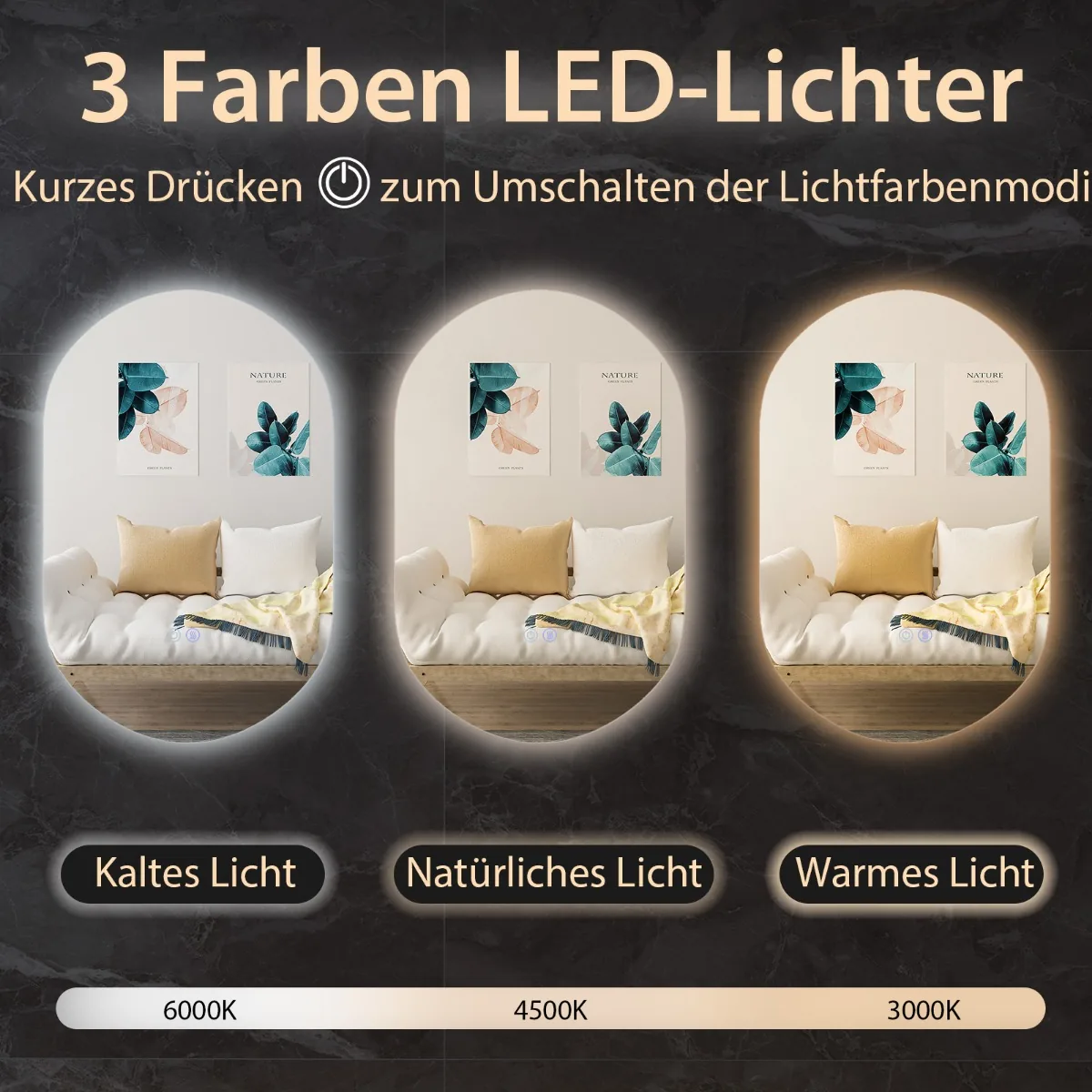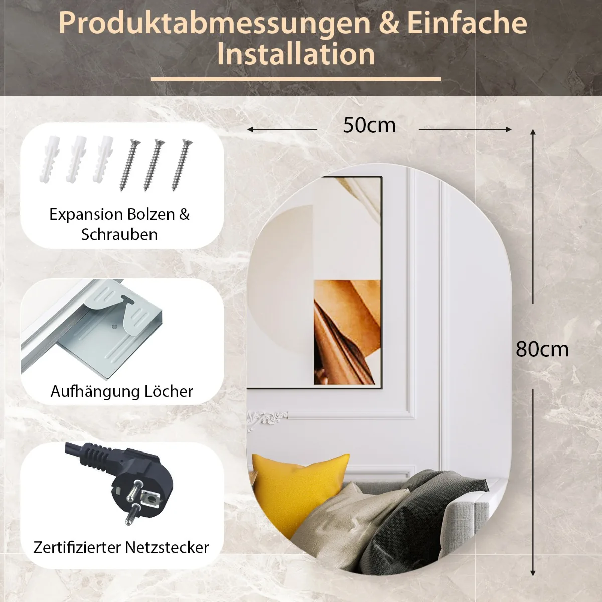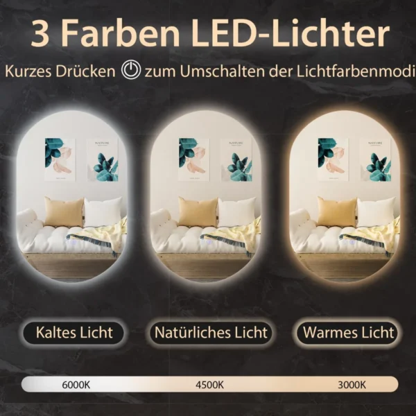 LED sieninis veidrodis 80×50 cm sidabrinės ir juodos spalvos yra funkcionalus ir praktiškas sprendimas vonios kambariui. Ovalo formos veidrodis su reguliuojamu LED apšvietimu užtikrina aiškų ir natūralų atspindį, pritaikytą skirtingoms apšvietimo sąlygoms. Integruota rasojimo apsaugos funkcija pagerina komfortą po dušo ar vonios.