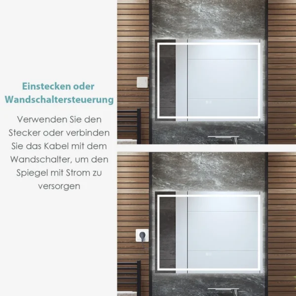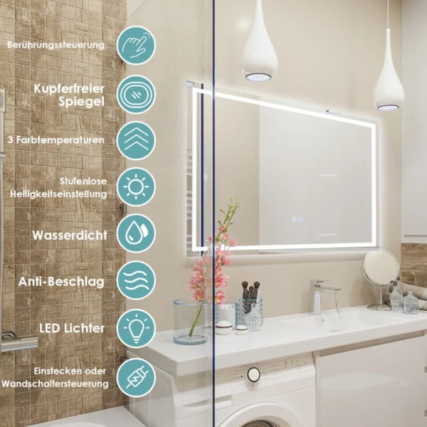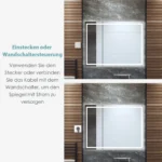 LED sieninis veidrodis 80x60x3,5 cm sidabrinės spalvos puikiai tinka vonios kambariui ar kitiems patalpų interjerams. Veidrodis turi reguliuojamą LED apšvietimą su trimis spalvų temperatūromis bei apsaugos nuo rasojimo funkciją, užtikrinančią aiškų atspindį net po dušo.