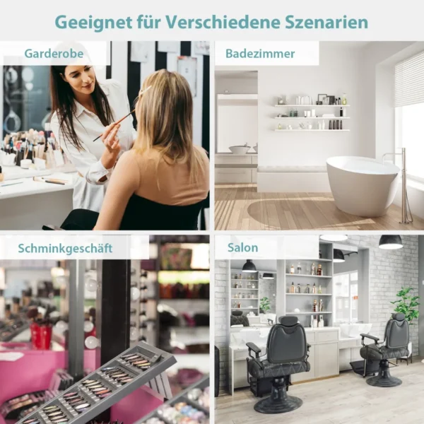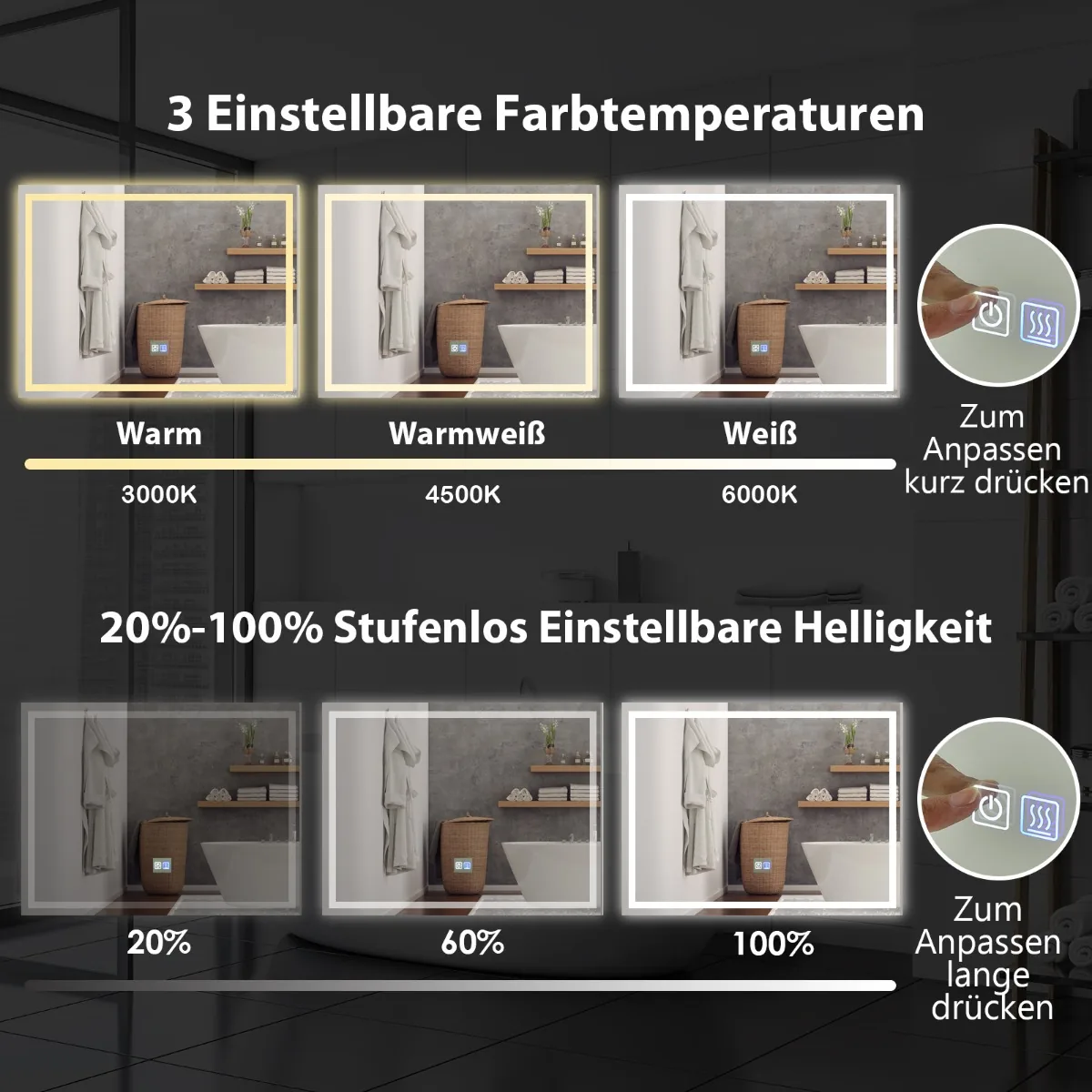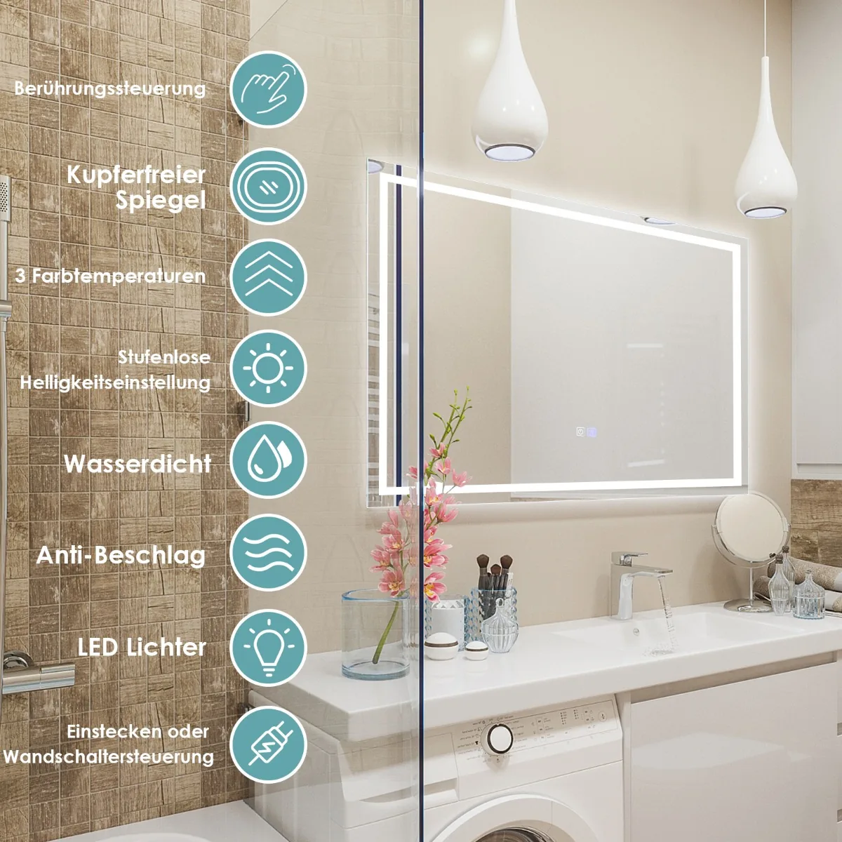 - LED veidrodžio apšvietimas valdomas jutikliniu jungikliu, leidžiančiu rinktis tarp baltos (6000K), šiltos baltos (4500K) ir šiltos (3000K) spalvų temperatūrų.