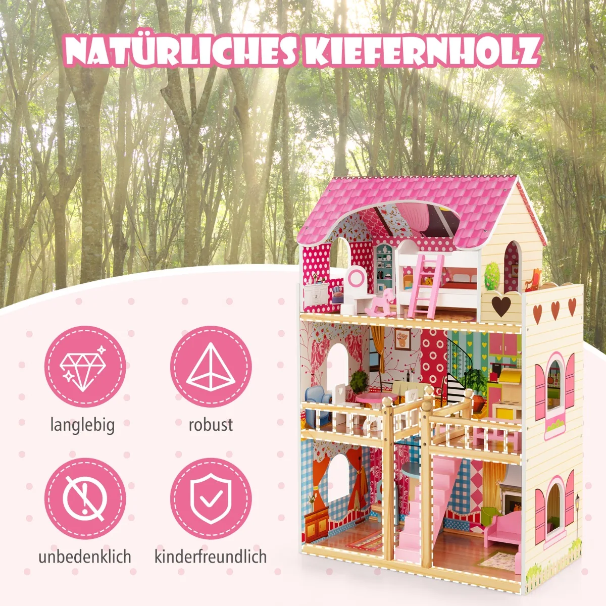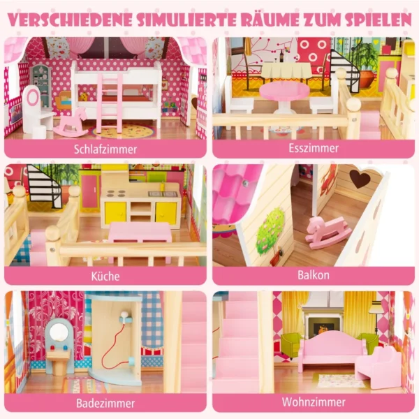 - Trijų aukštų lėlių namelis su šešiais modeliuotais kambariais: miegamasis, valgomasis, virtuvė, balkonas, vonios kambarys ir svetainė.