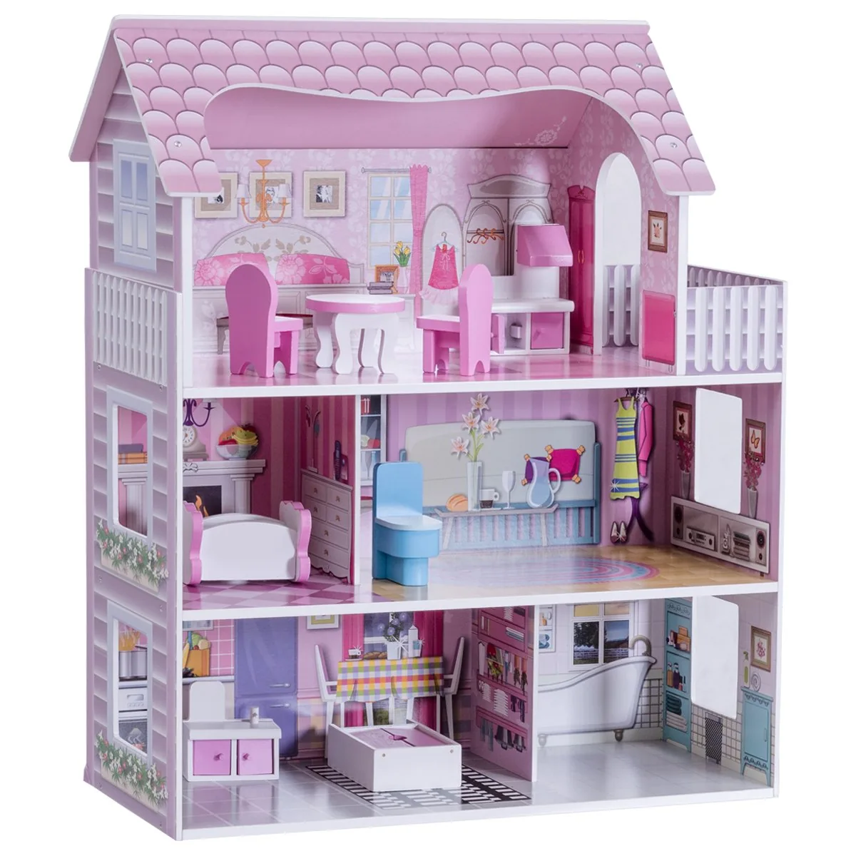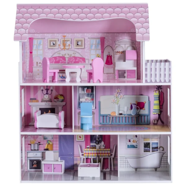 • Trijų aukštų lėlių namelis su penkiais kambariais ir balkonu.