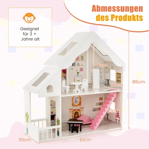 Lėlių namelis 81x30x86cm įvairių spalvų – puikus žaislas mažoms mergaitėms, kuris skatina kūrybiškumą ir vaizduotę. Šis medinis lėlių namelis užtikrina įtraukiantį žaidimą su 3 aukštais, 6 kambariais ir mini baldais. Tai praktiškas pasirinkimas vaikams nuo 3 metų mėgautis ilgomis žaidimų valandomis.