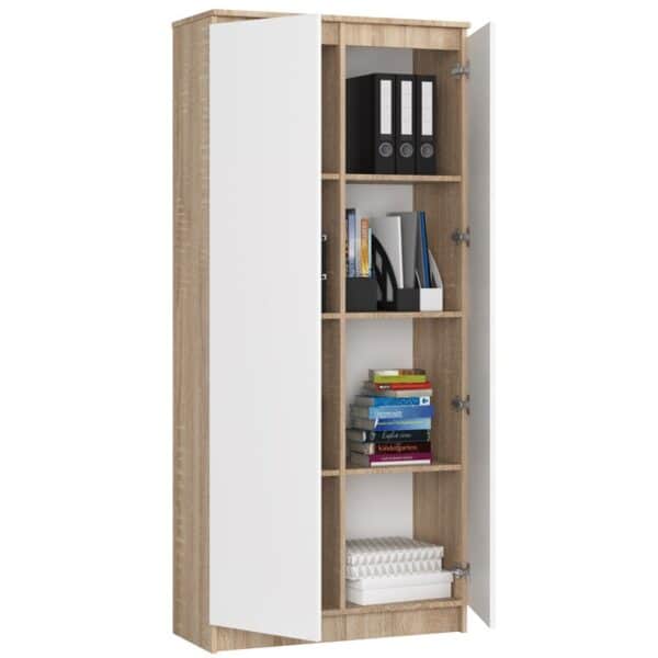 Spintelės formos biuro knygų lentyna R 80 cm – tai CLP klasės sistemos baldas, pasižymintis itin moderniu stiliumi ir solidžiu apdirbimu. Tai savaime surenkamas baldas, puikiai tinkantis tokiose patalpose kaip svetainė ar biuras. Knygų spinta pagaminta iš aukštos kokybės laminuotos medienos ir nulakuota matinėmis, švelniomis, tamsiai rudos spalvos ir sonoma spalvomis. Dėl šios priežasties šio tipo biuro lentynos pritaikomos prie kitų CLP sistemos baldų (pvz., stalų ar komodų). CLP biuro lentynos, tamsiai rudos spalvos / sonoma spalvos turi standartinius šios serijos baldų parametrus: – 2 visiškai varstomos venge spalvos durys ir 8 lentynos sonomos spalvos, – matmenys 80x180x35 cm (plotis x aukštis x ilgis), – svoris: 60 kg, – 16 mm storio laminuotos plokštės su papildoma ABS lukštu naudojimas biuro lentynų kraštuose, – didelis atsparumas dilimui, nes naudojama Kronospan medžiaga, – stabilios lentynos ant bet kokio tipo paviršiaus (įskaitant medines grindis arba keramines plyteles).