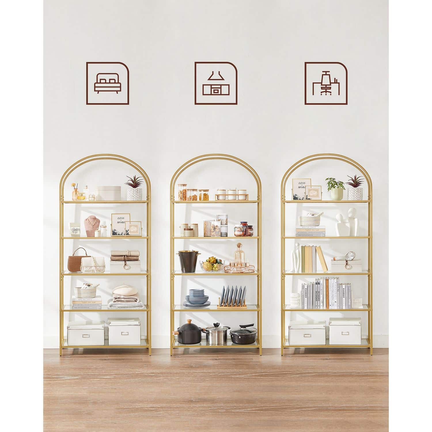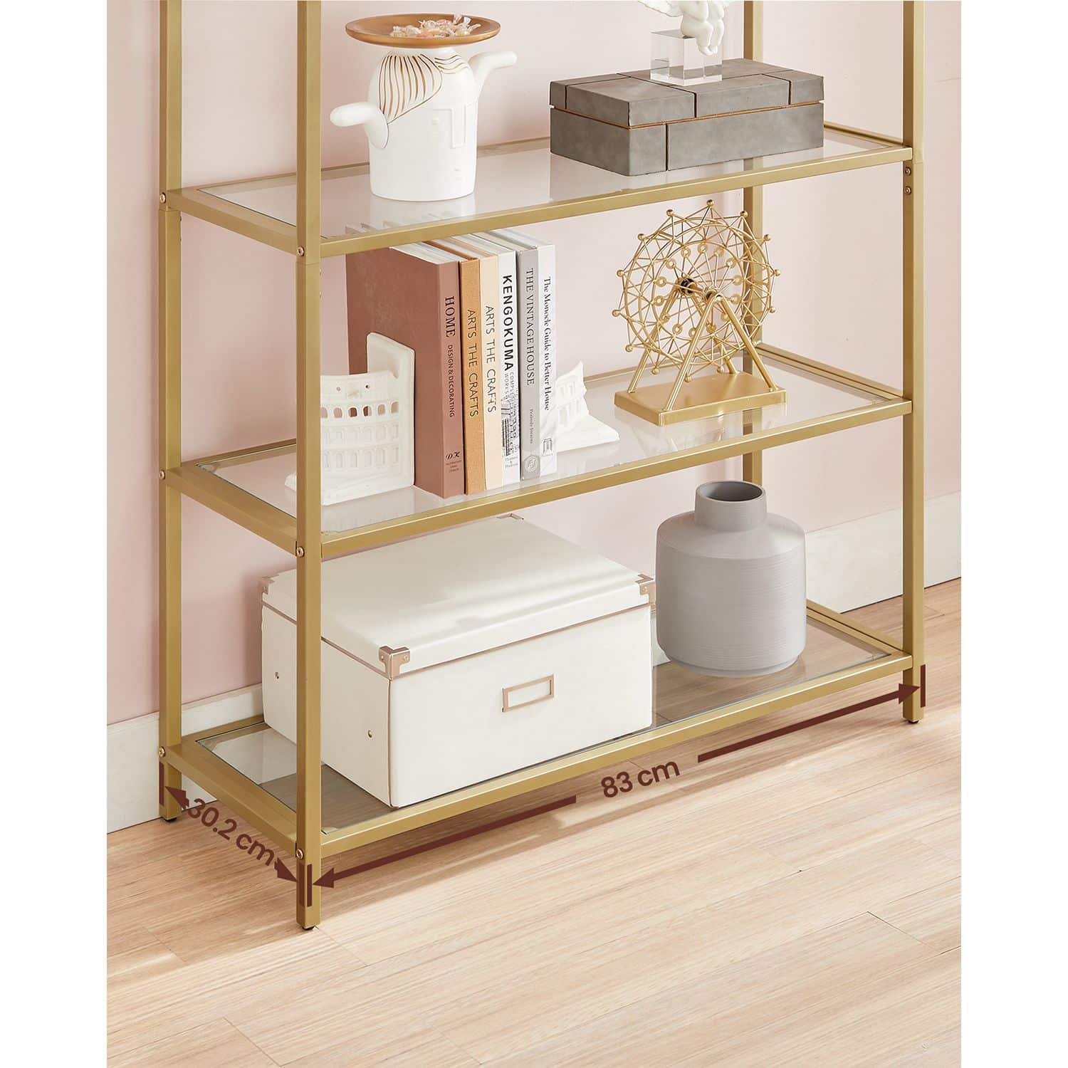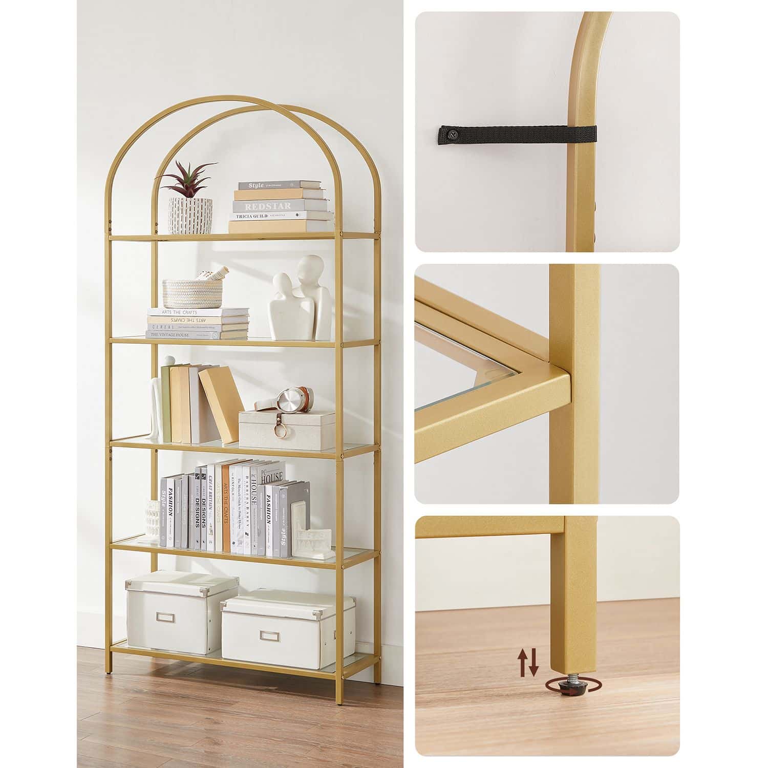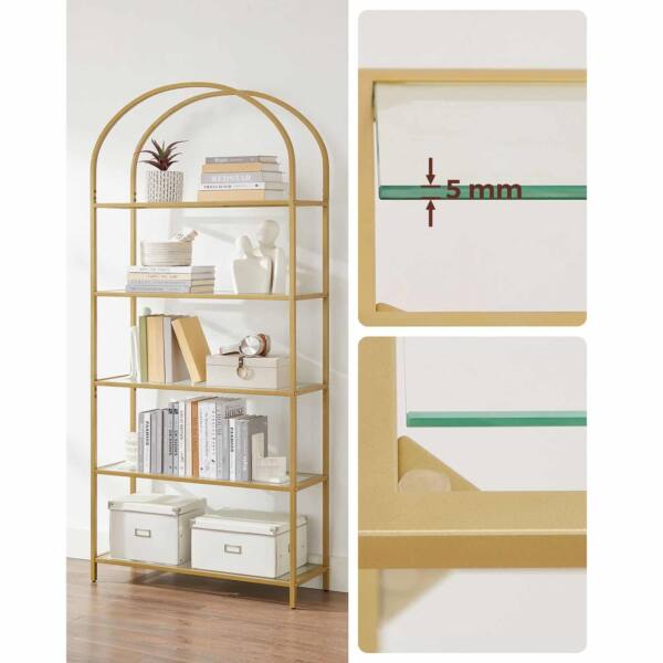 Ši elegantiška lentyna su 5 lentynomis iš grūdinto stiklo ir auksinės spalvos rėmu yra puikus pasirinkimas jūsų namų ar biuro interjerui. Jos modernus dizainas ir aukštos kokybės medžiagos užtikrina ilgaamžiškumą ir stilingą išvaizdą.