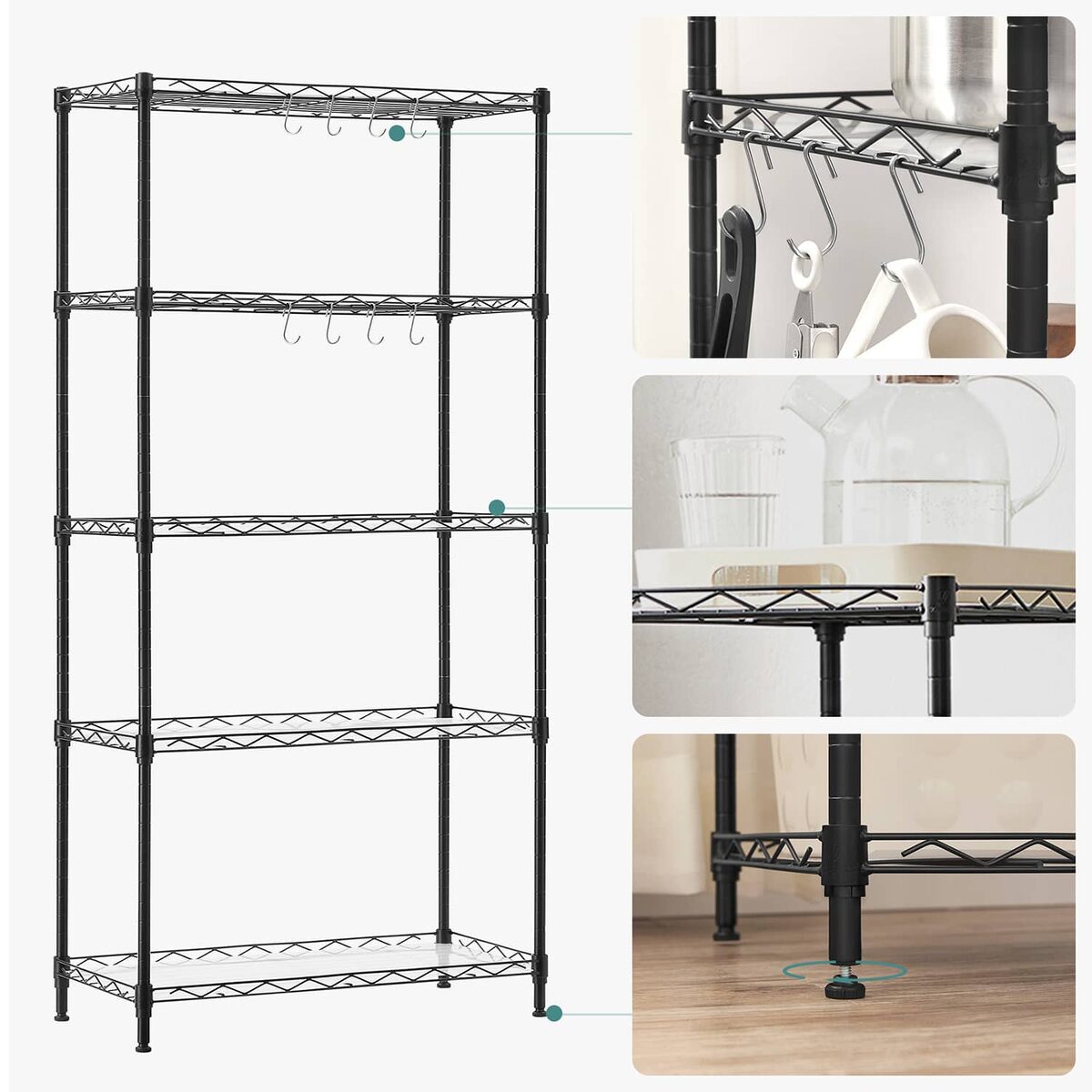 Ši juoda plieninė lentyna su kabliukais LGR065B01 yra puikus sprendimas jūsų virtuvei. Jos dydis yra 59 x 29 x 128 cm , o svoris – tik 5 kg. Lentyna gali atlaikyti iki 20 kg statinę apkrovą vienam lentynos lygiui, o bendra didžiausia statinė apkrova siekia 100 kg.