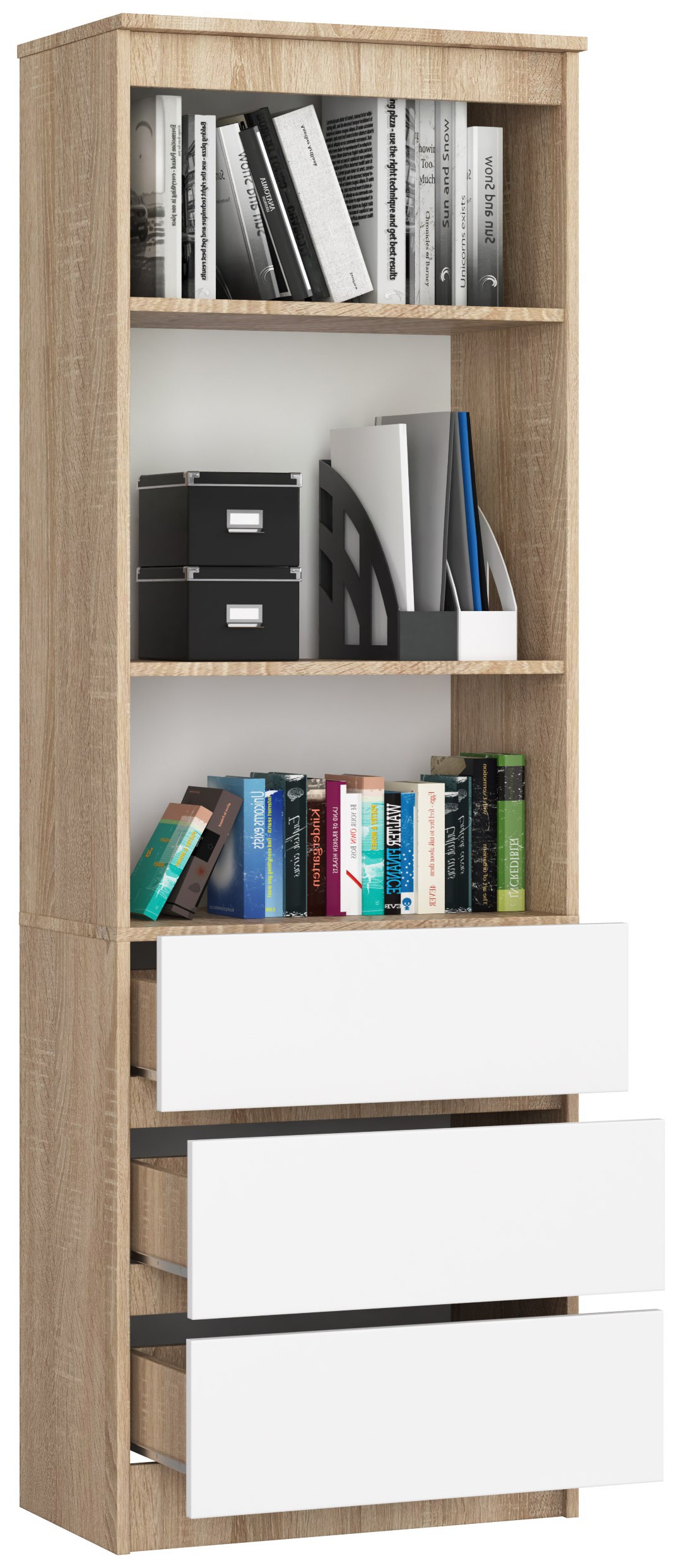 Biuro knygų spinta, CLP modelis išsiskiria nepaprastu spalvų deriniu. Natūrali sonomos ąžuolo spalva ant baldų korpuso ir universalus,, baltos spalvos spalvoss stalčių fasadas yra puikus derinys, kuris puikiai derės prie modernaus biuro ir namų biuro stiliaus. Elegantiška išvaizda yra didelis šio modelio pliusas. Biuro knygų spinta pasižymi labai apgalvotu dizainu. Trys atviros, erdvios lentynos lengvai talpina dokumentus segtuvuose, pavyzdžiui, darbuotojų bylas, sąskaitas ir sąskaitas faktūras. Erdviuose stalčiuose galima laikyti smulkius raštinės reikmenis ir raštinės reikmenis, tokius kaip spausdintuvo popierius, sąvaržėlės, perforatoriai ar lipnūs lapeliai. CLP modelis skirtas darbui biure pagerinti. Praktiškų sprendimų dėka visi darbo įrankiai yra po ranka, o tai neabejotinai turi įtakos darbo efektyvumui. „Sonoma /, tamsiai rudos spalvos“ knygų spinta turėtų būti kiekviename biure ir namų biure, nes toks įrangos elementas savo naudotojams suteikia daug privalumų. Puikiai tiks ir svetainėje. – Knygų lentyna iš Kronospan laminuotos plokštės, atspari dilimui 16mm. – Knygų spinta turi lentynas, reguliuojamas 3 lygiais, iš anksto išgręžtos tvirtinimo skylės – Kraštai faneruoti su ABS apvadu, užtikrinančiu aukštą apsaugą nuo pažeidimų – GTV ritinėlių kreiptuvai su prailginimo užraktu – Stovas siunčiamas pakuotėse patiems – surinkimas – Instrukcija pridedama – Garantija 24 mėn.