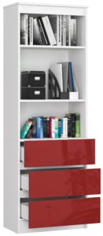 Įdomus klasikinės, baltos spalvos ir ryškios raudonos spalvos derinys tikrai teigiamai nustebins kiekvieną žmogų, mėgstantį retkarčiais pasilepinti šiek tiek ekstravagancijos. Jei ir jūs norite šiek tiek beprotybės tvarkydami savo svajonių erdvę, raginame susipažinti su mūsų internetinės parduotuvės klientų itin populiariu sprendimu. Jame dera konkurencinga kaina, solidus darbas ir efektyvus dizainas. Aptariamas sprendimas – 60 centimetrų pločio biuro lentyna, susidedanti iš trijų erdvių stalčių ir trijų lentynų. Tai funkcionalus pasiūlymas, kuris bus naudojamas ypač vaikų ir paauglių kambariuose, taip pat biuruose ir svetainėse. Pažymėtina kruopštus darbas, dėmesys detalėms ir blizgūs fasadai, suteikiantys visumai nepakartojamo žavesio. Šis baldas pagamintas iš 16 mm storio laminuotos plokštės, kuri yra itin atspari trinčiai. – Knygų lentyna pagaminta iš 16 mm Kronospan laminuotos plokštės, atspari trinčiai – Stalčių fasadai pagaminti iš akrilo MDF plokštės. Jai būdinga – Knygų spintoje yra lentynos, reguliuojamos 3 lygiais, iš anksto išgręžtos tvirtinimo skylės – Dvipusis durelių mazgas – surinkimas dešinėje ir kairėje stelažo pusėje. – Kraštais apklijuotas ABS, užtikrinantis aukštą apsaugą nuo pažeidimų – GTV ritininiai kreiptuvai su prailginimo užraktu – Knygų spinta siunčiama pakuotėse, kad būtų galima surinkti savarankiškai – Instrukcijos pridedamos – 24 mėnesių garantija