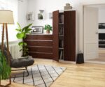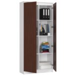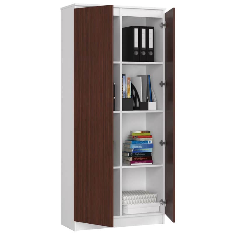 Biuro knygų spinta R 80 cm CLP versijoje su dvejomis durimis yra spalvota su baltomis sienomis ir vidinėmis lentynomis bei venge spalvos durimis. Knygų spinta turi labai universalų charakterį, todėl tinka ne tik gyvenamuosiuose ar miegamuosiuose kambariuose, bet ir patalpose, pavyzdžiui, biuruose. Šio tipo spintelės yra idealus sprendimas knygoms, dokumentams ir kitiems reguliariai naudojamiems gaminiams laikyti. Spinta labai patogi naudoti ir derinama su kitais, tamsiai rudos spalvos spalvos interjero dizaino elementais. Pagrindiniai CLP biuro lentynų parametrai yra šie: – aukšta kokybė, nes naudojama 16 mm pločio laminuota plokštė, atspari trinčiai (Kronospan medžiagos) ir kraštai padengti ABS briauna, – 8 lentynos, pasižyminčios dideliu atsparumu sunkiam spintelių turiniui, – savaime surenkamos ant komplektuojamų elementų, – matmenys: plotis 80 cm, aukštis 180 cm, ilgis 35 cm, – matinės varstomos durys, – svoris: 60 kg, – tvirtos kojelės, skirtos stabiliam stovo montavimui ant įvairių paviršių.