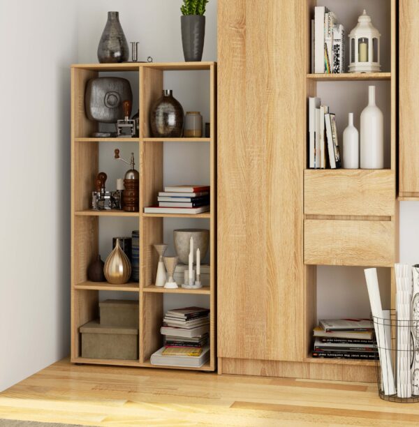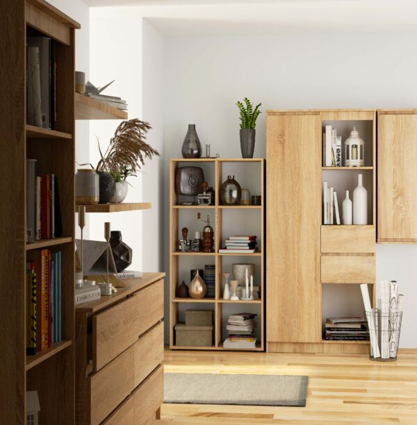 QUAD 8 lentynų knygų lentyna turi daug privalumų, į kuriuos verta atkreipti dėmesį: – talpa: joje yra 8 lentynos, kurias galima laisvai išdėstyti, – ilgaamžiškumas: baldai pagamintas iš aukštos kokybės laminuotos plokštės, atsparios dilimui, – atsparumas: stelažo kraštai padengti ABS apvadu, kuris užtikrina aukštą apsaugą nuo pažeidimų, – lengvas surinkimas : baldą reikia surinkti savarankiškai, o tai nesudėtinga – prie užsakymo pridedama instrukcija, – elegantiška išvaizda: knygų spinta pasižymi paprasta forma, yra stilingos sonomos ąžuolo spalvos , – universalumas: baldai tiks įvairiose patalpose, namuose ir biure, – patraukli kaina, – 24 mėn. garantija.