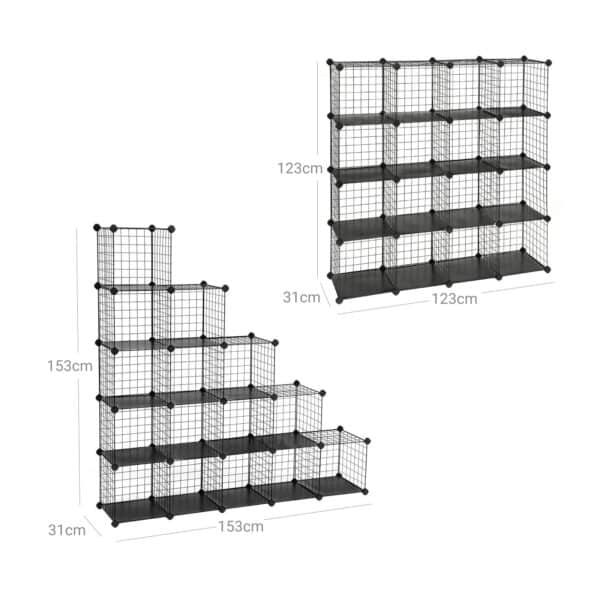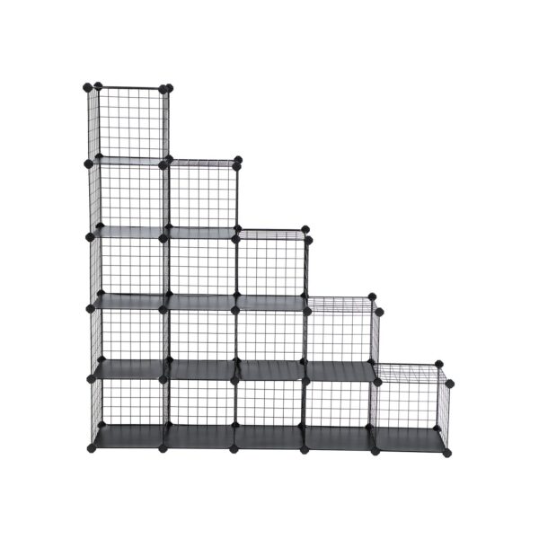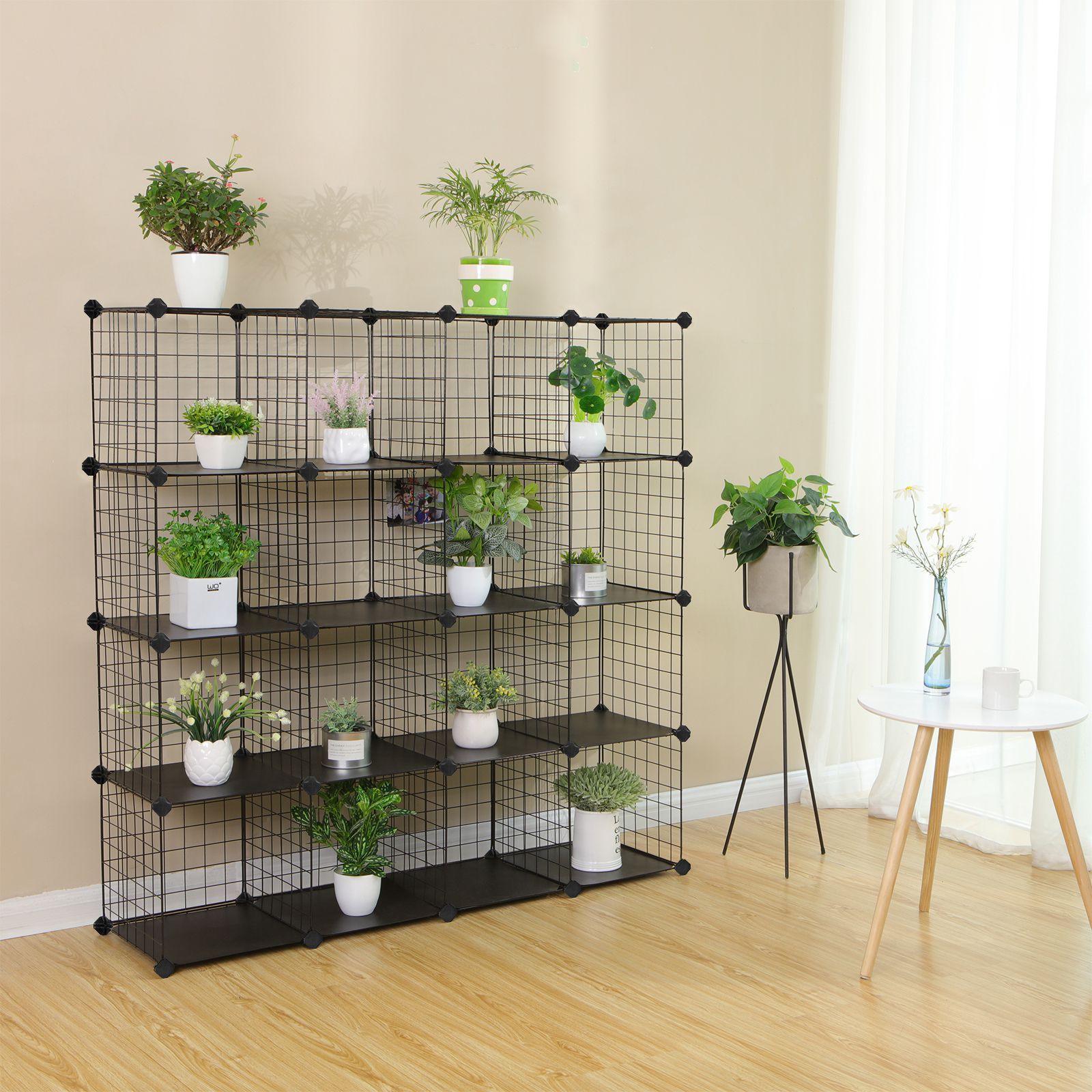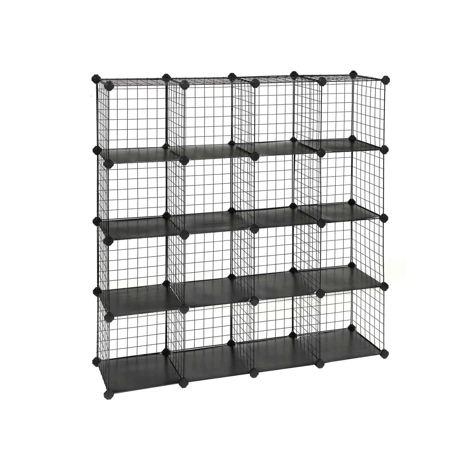 Viskas čia telpa… Naudokite mūsų metalinės vielos laikymo sistemą savo drabužiams, batams, biuro reikmenims, knygoms, žurnalams ir kt. Turite 16 kubelių, kurių kiekvieno apačioje yra PP plastikinė plokštelė. Lentyną galima pastatyti bet kurioje patalpoje ir pritaikyti ten esančioms sąlygoms dėl tinklelį primenančios prijungimo sistemos. Tai reiškia, kad lentyną galima lengvai integruoti į savo svetainę, miegamąjį, vaikų kambarį arba vonios kambarį. Taip pat puikiai tinka garaže, rūsyje ar prieškambaryje, tačiau saugokite gaminį nuo lietaus, tiesioginių saulės spindulių ar vėjo, todėl nestatykite jo lauke. Taip lentyna galėsite džiaugtis ilgą laiką.