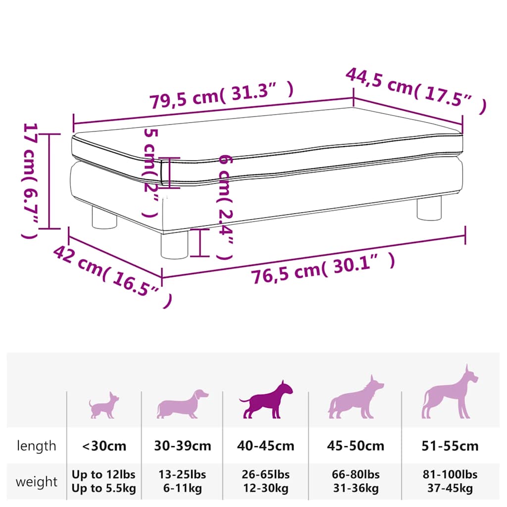 Su šia lova šunims su prailginimu suteikite savo plaukuotam draugui jaukią ir patogią vietą poilsiui! Patogi ir minkšta medžiaga: sofa augintiniams yra paminkštinta storu ir minkštu porolonu bei dengta aksomu, tad ji suteikia pakankamą atramą ir užtikrina aukščiausio lygio komfortą jūsų mielam augintiniui ilsėtis.Tvirtas ir patvarus rėmas: pušies medienos masyvo rėmas suteikia sofai šunims tvirtumo ir patvarumo. Keturios kojelės taip pat suteikia papildomo stabilumo.Itin didelė miegojimui skirta zona: lova šunims pristatoma su prailginimu, kuris suteikia papildomos vietos jūsų šuniui išsitiesti ir pailsėti. Prailginimas taip pat gali būti naudojamas atskirai, kaip lova šunims.Stilingas dizainas: ši kušetė šunims puikiai tiks bet kokiame interjere bei taps puikia jūsų svetainės ar miegamojo detale. Pastaba:Prieš įsigydami, išmatuokite savo augintinio kūno ilgį.