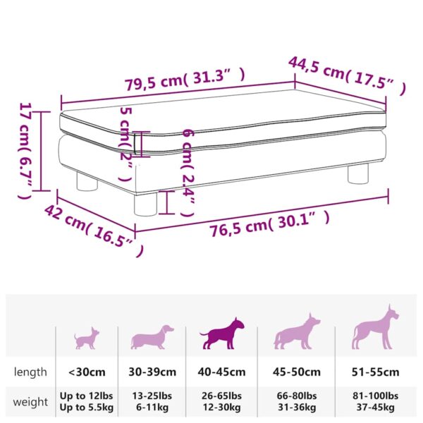 Su šia lova šunims su prailginimu suteikite savo plaukuotam draugui jaukią ir patogią vietą poilsiui! Patogi ir minkšta medžiaga: sofa augintiniams yra paminkštinta storu ir minkštu porolonu bei dengta aksomu, tad ji suteikia pakankamą atramą ir užtikrina aukščiausio lygio komfortą jūsų mielam augintiniui ilsėtis.Tvirtas ir patvarus rėmas: pušies medienos masyvo rėmas suteikia sofai šunims tvirtumo ir patvarumo. Keturios kojelės taip pat suteikia papildomo stabilumo.Itin didelė miegojimui skirta zona: lova šunims pristatoma su prailginimu, kuris suteikia papildomos vietos jūsų šuniui išsitiesti ir pailsėti. Prailginimas taip pat gali būti naudojamas atskirai, kaip lova šunims.Stilingas dizainas: ši kušetė šunims puikiai tiks bet kokiame interjere bei taps puikia jūsų svetainės ar miegamojo detale. Pastaba:Prieš įsigydami, išmatuokite savo augintinio kūno ilgį.