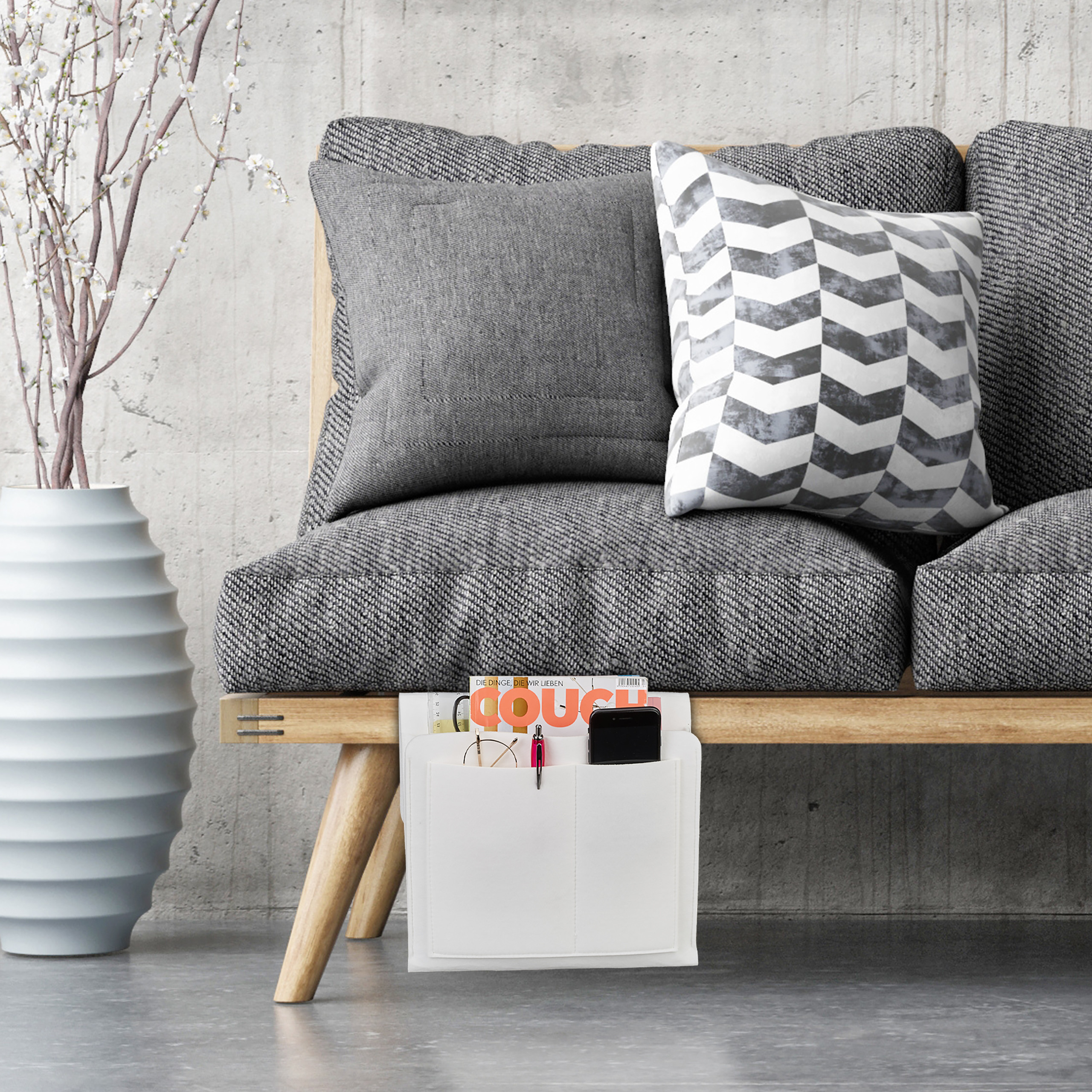 Pristatome Jums elegantišką ir funkcionalų sprendimą Jūsų miegamojo ar svetainės erdvei – pakabinamą lovos kišenę. Šis baltos spalvos veltinio maišelis ne tik suteiks papildomos vietos, bet ir padės palaikyti tvarką bei stilių Jūsų namuose.