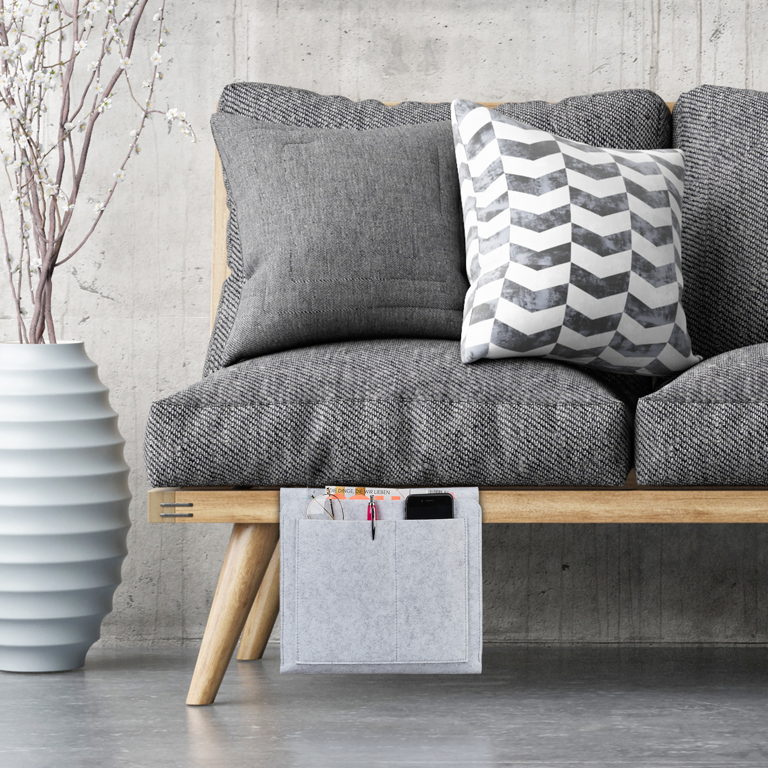 Pristatome jums elegantišką ir funkcionalų sprendimą jūsų miegamojo ar svetainės organizavimui – pilkos spalvos lovos kišenę. Šis pakabinamas lovos krepšys padės sukurti daugiau vietos ir tvarkos jūsų aplinkoje, suteikdamas patogią vietą laikyti svarbiausius daiktus šalia jūsų lovos ar sofos.