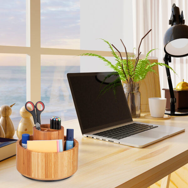 Įneškite elegancijos ir tvarkos į savo kasdienę grožio rutiną su šiuo išskirtiniu makiažo organizatoriumi. Pagamintas iš natūralaus bambuko, šis šviesiai rudos spalvos laikiklis ne tik puikiai atrodo, bet ir yra itin funkcionalus.