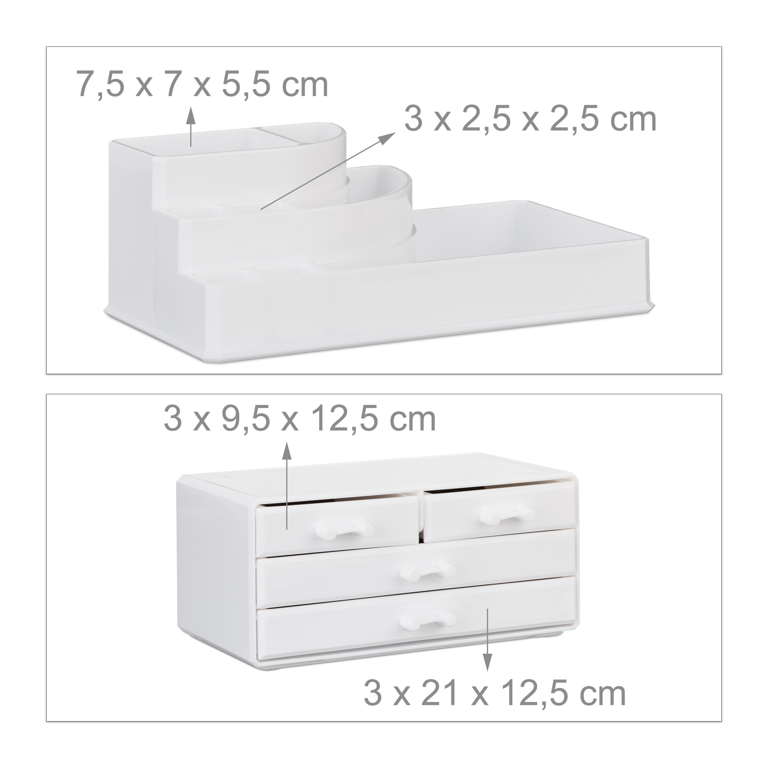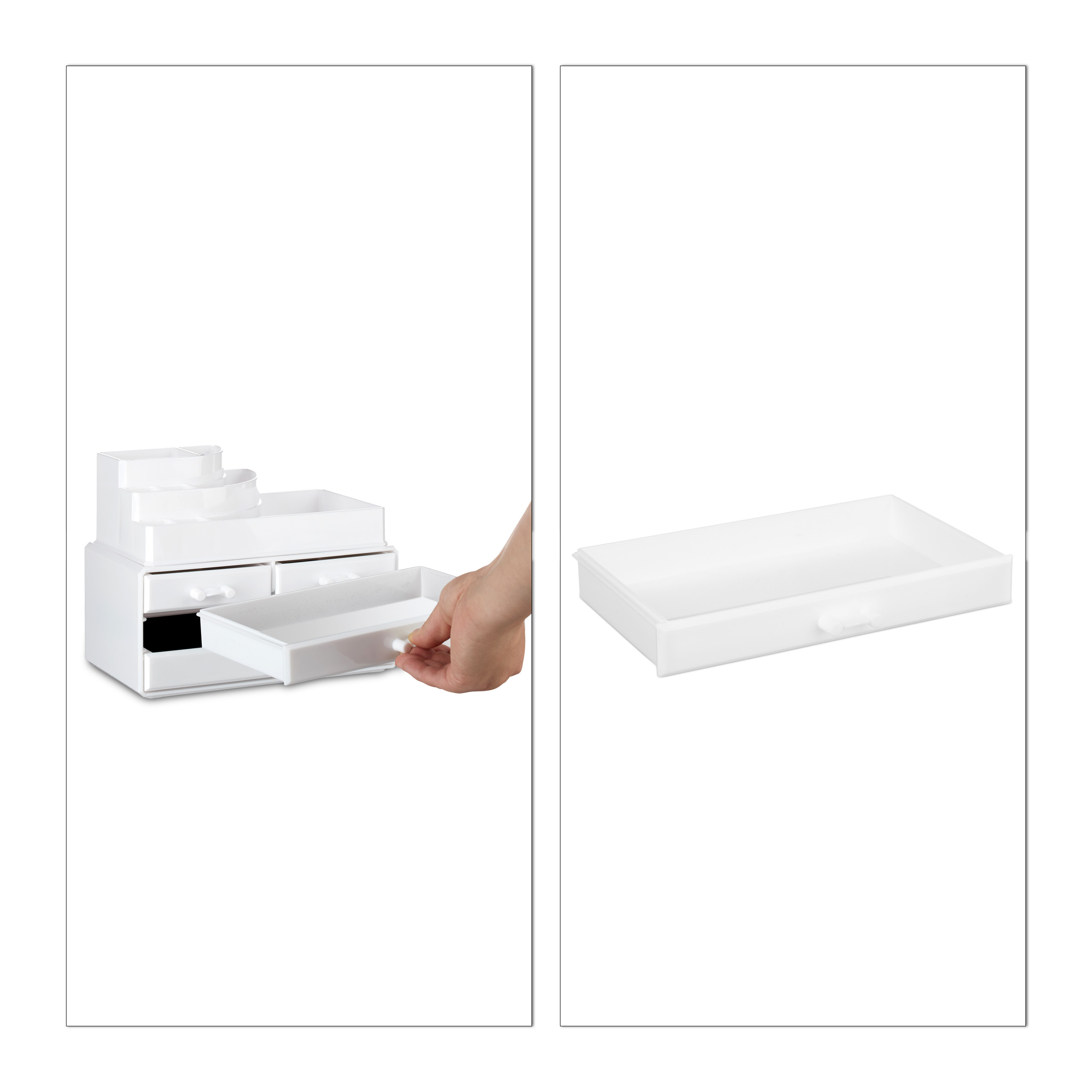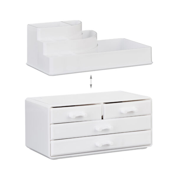 - Dviejų dalių dizainas: Organizatorius susideda iš kosmetikos dėžutės su 4 stalčiais ir makiažo laikiklio su 8 skyreliais, leidžiančių patogiai ir aiškiai laikyti įvairius daiktus.