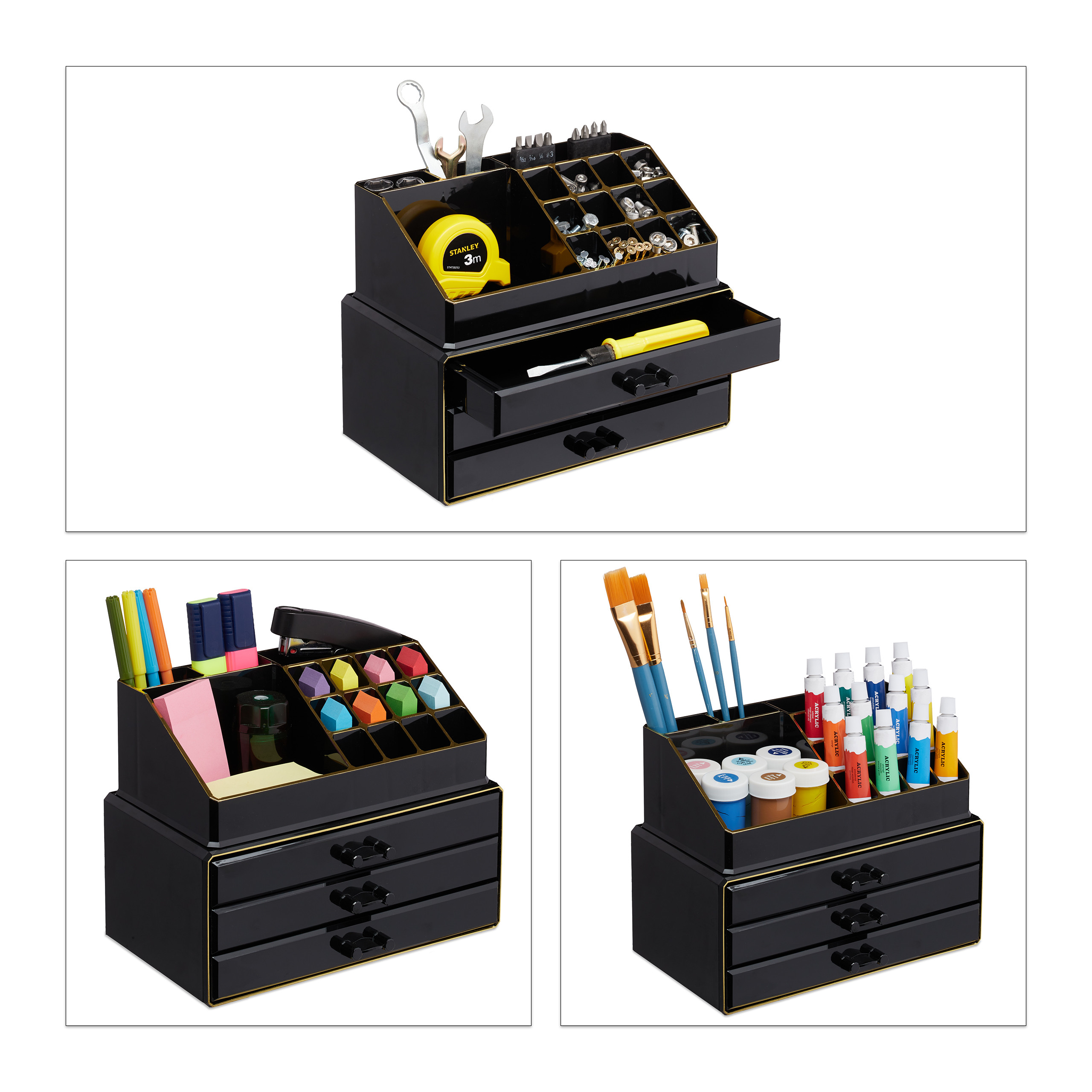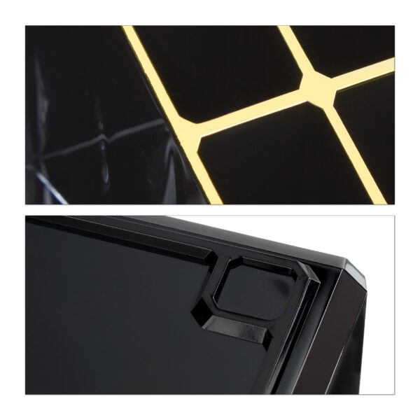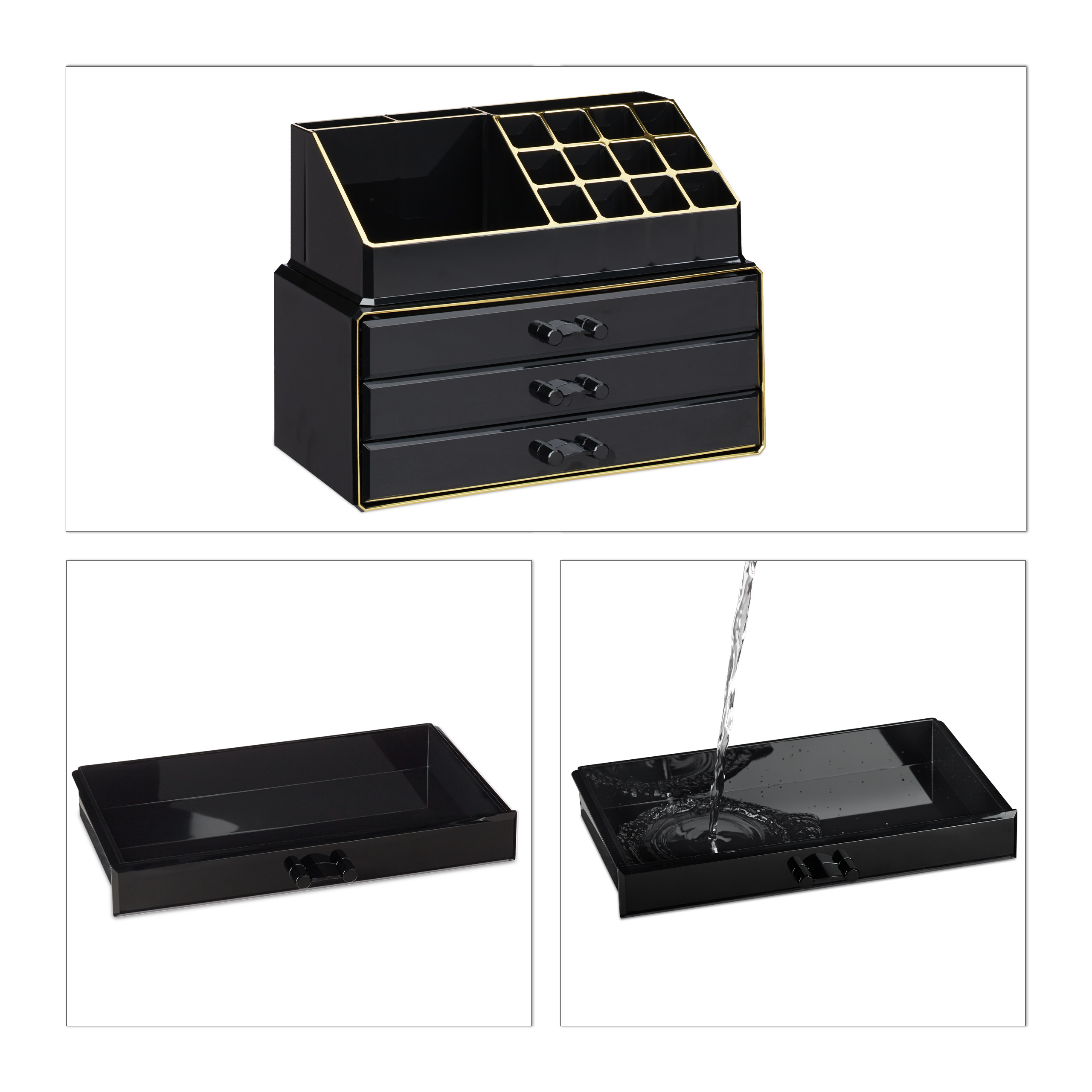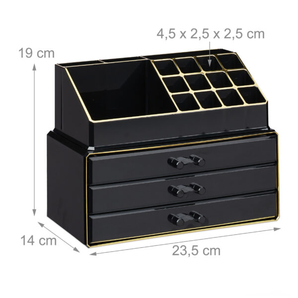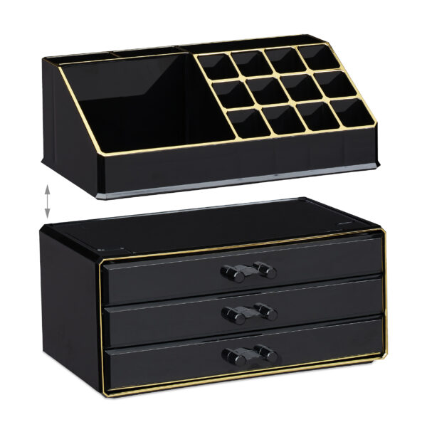 Įneškite prabangos ir tvarkos į savo kasdienę grožio rutiną su šiuo išskirtiniu makiažo organizatoriumi. Jo juodos ir auksinės spalvos dizainas ne tik suteikia elegancijos, bet ir puikiai dera prie bet kokio interjero. Šis kompaktiškas, tačiau talpus organizatorius yra idealus sprendimas jūsų kosmetikos ir papuošalų laikymui.