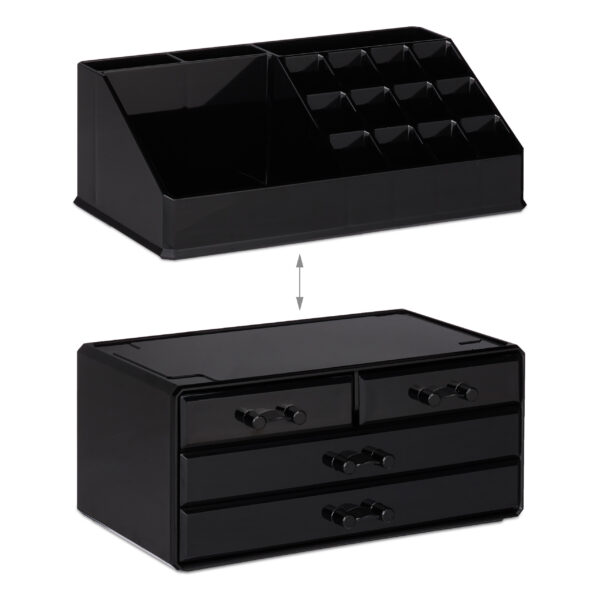- Modulinis Dizainas: Organizatorius susideda iš 2 dalių, kurias galite sukrauti vieną ant kitos arba naudoti atskirai, suteikiant jums lankstumo kuriant vonios ar miegamojo laikymo sprendimus.