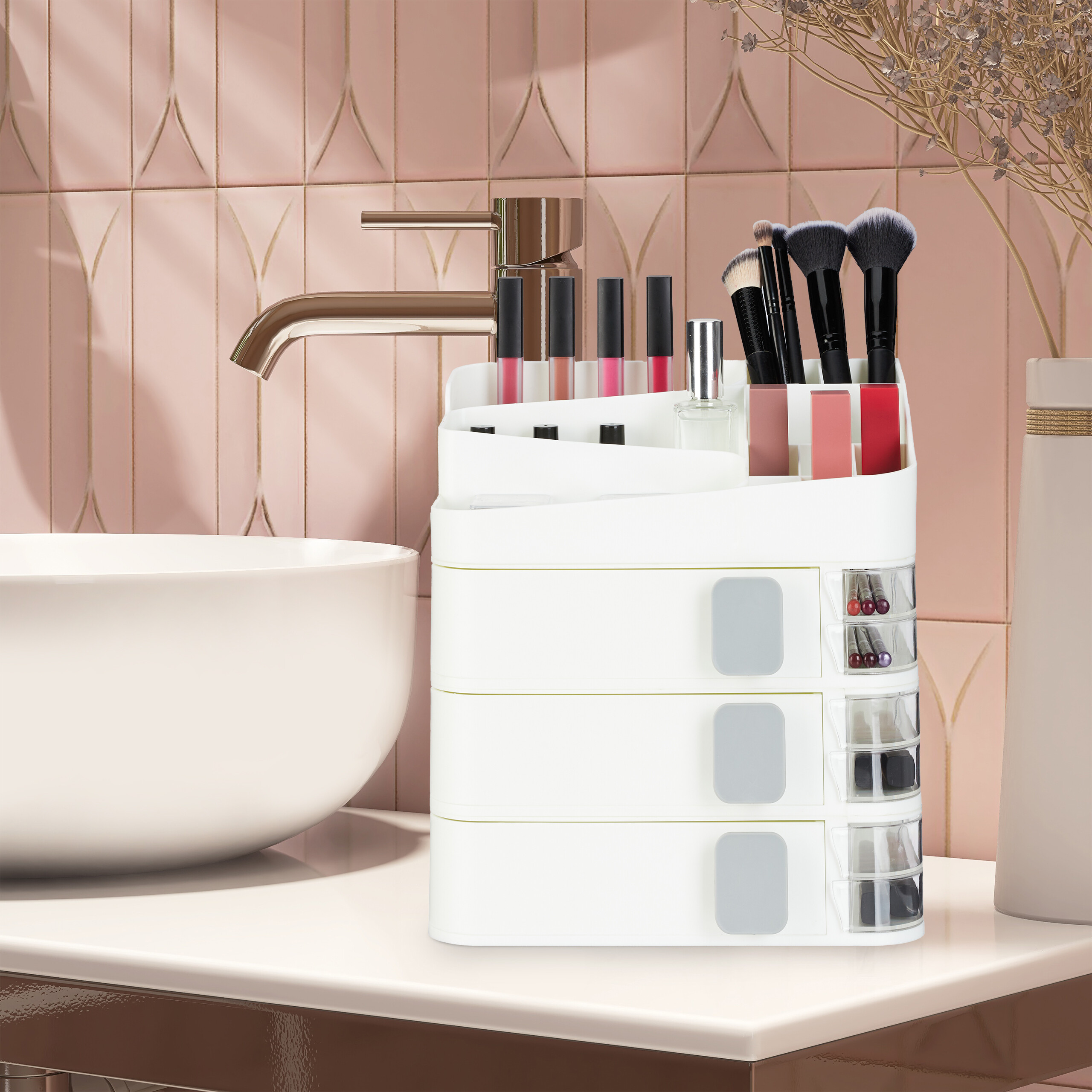 Šis universalus makiažo organizatorius yra puikus sprendimas jūsų kosmetikos ir makiažo reikmenų laikymui tiek vonios kambaryje, tiek ant tualetinio staliuko. Pagamintas iš tvirto plastiko, jis užtikrina ilgaamžiškumą ir patikimumą, o jo elegantiškas baltas dizainas harmoningai įsilieja į bet kokį interjerą.