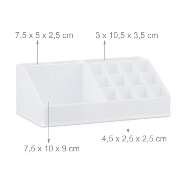 - Lūpų Dažų Laikiklis: Idealiai tinka lūpų blizgesiui, nagų lakui, kosmetiniams rašikliams ir šepetėliams.