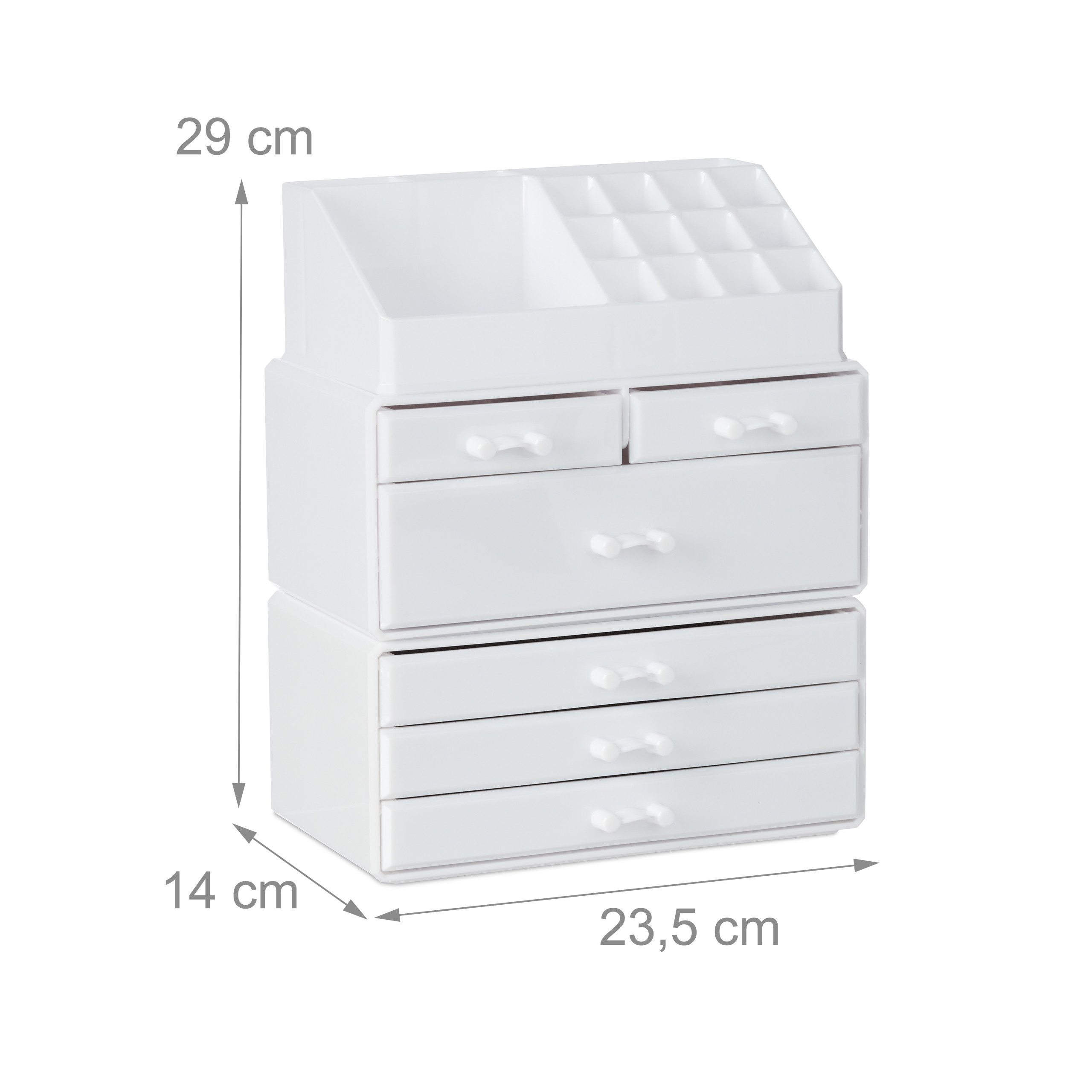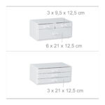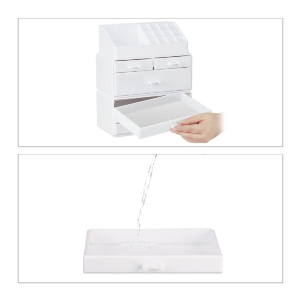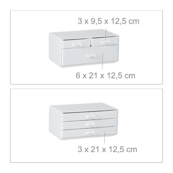 Pristatome Jums išskirtinį makiažo organizatorių su stalčiais, kurio matmenys yra 29×23,5×14 cm. Šis baltos spalvos aksesuaras ne tik suteiks Jūsų tualetiniam staliukui elegancijos, bet ir padės išlaikyti tvarką bei patogumą kasdienėje grožio rutinoje.