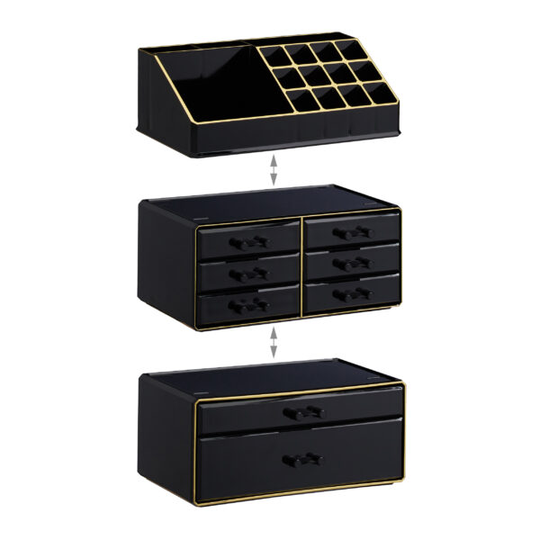 Makiažo organizatorius susideda iš trijų elementų, kuriuos galite naudoti atskirai arba sukrauti vieną ant kito, kad sutaupytumėte vietos. Jo juodos ir auksinės spalvos derinys suteikia prabangos pojūtį, o tvirtas akrilo korpusas užtikrina ilgaamžiškumą.