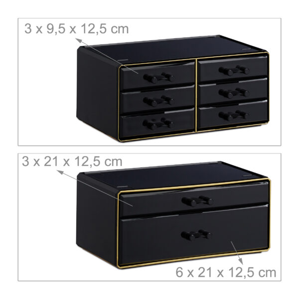 - Įvairių dydžių stalčiai: Puikiai tinka kremams, buteliukams, pudrai, akių šešėliams, karoliams, žiedams ir ausų segtukams.