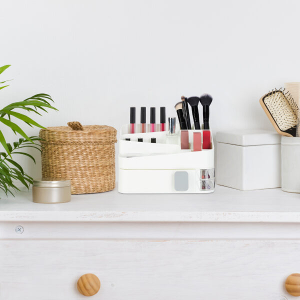 Įneškite tvarkos ir elegancijos į savo kasdienę grožio rutiną su šiuo universaliu makiažo organizatoriumi. Puikiai pritaikytas tiek vonios kambariui, tiek tualetiniam stalui, šis organizatorius padės jums išlaikyti visus kosmetikos ir makiažo reikmenis tvarkingai ir lengvai pasiekiamus.