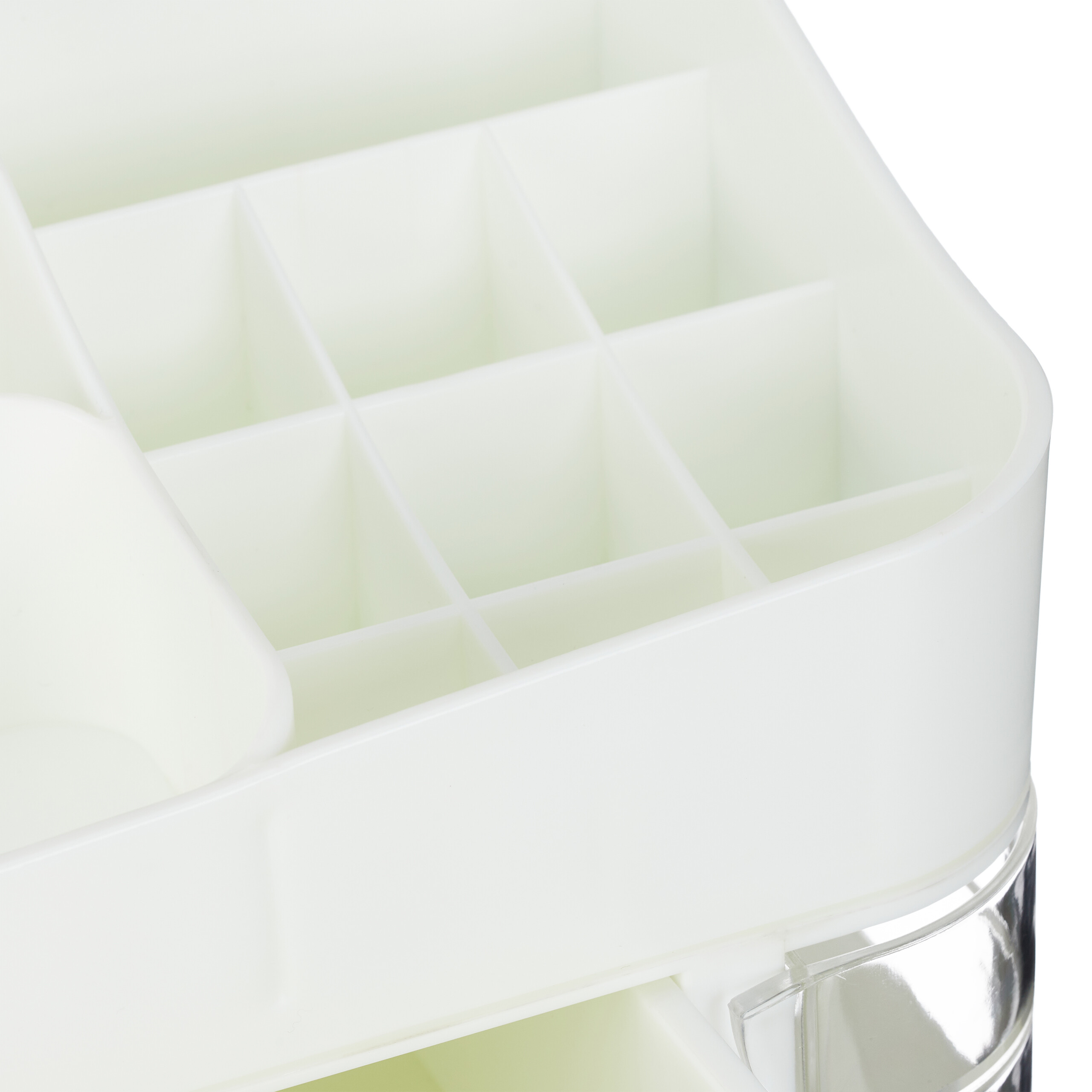 - Didelis Stalčius: Talpus stalčius su dviem permatomais šoniniais skyreliais, puikiai tinka plaukų kaklaraiščiams, šepečiams ir kitiems aksesuarams laikyti.