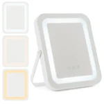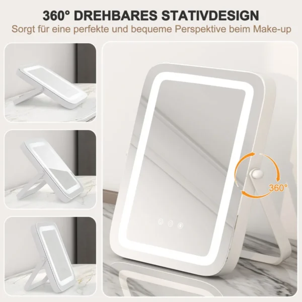 Makiažo veidrodis 25x3x30cm, baltos spalvos – praktiškas pasirinkimas kasdieninei grožio priežiūrai. LED apšvietimas su keliomis spalvomis ir reguliuojamu ryškumu padeda tiksliai atlikti makiažą, o 360° pasukamas stovas užtikrina patogų naudojimą.