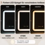 - Veidrodis turi tris LED apšvietimo režimus: 6500K šaltai baltą, 4750K baltą ir 3000K geltoną šviesą.